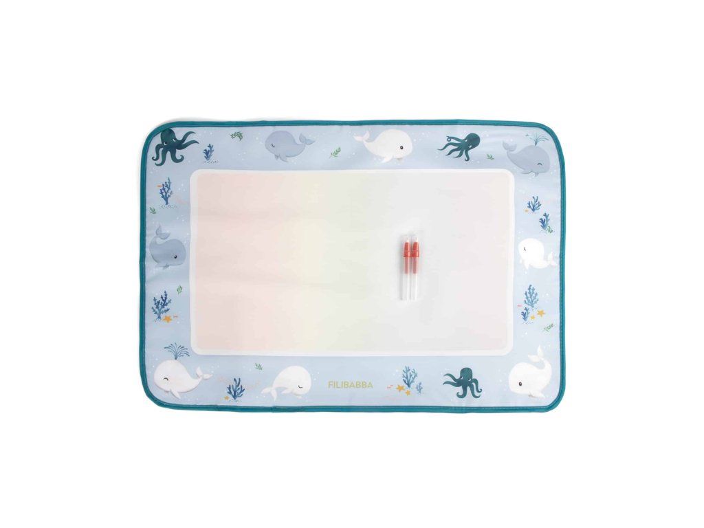 Tichý moment, jemný dotyk vody – a zrazu farby rozkvitnú ako mágiou. Táto snová vodná maliarska podložka umožňuje malým umelcom sledovať, ako ich fantázia ožíva v jemných dúhových odtieňoch – bez neporiadku a škvŕn. Nie sú potrebné farby ani fixky – stačí naplniť jedno z dvoch priložených pier vodou a sledovať, ako sa farby objavujú. Pokojný a hravý spôsob, ako objavovať kreativitu stále dookola. Podložka je dostatočne veľká na to, aby na nej mohli kresliť dve deti naraz. Keď kresba uschne, povrch je opäť pripravený na nové umelecké dobrodružstvá. Je ľahká a jednoducho skladateľná s praktickým popruhom – ideálna na doma aj na cesty, od obývačky až po slnečný piknik. Dizajn je inšpirovaný čarovným podmorským svetom – veľryba Christian pokojne pláva medzi svojou morskou rodinou, zatiaľ čo jemné prúdy sa vlnia na krémovom pozadí a vytvárajú pokojnú, snovú atmosféru. Základné vlastnosti:- Rozmery: 70 × 55 cm