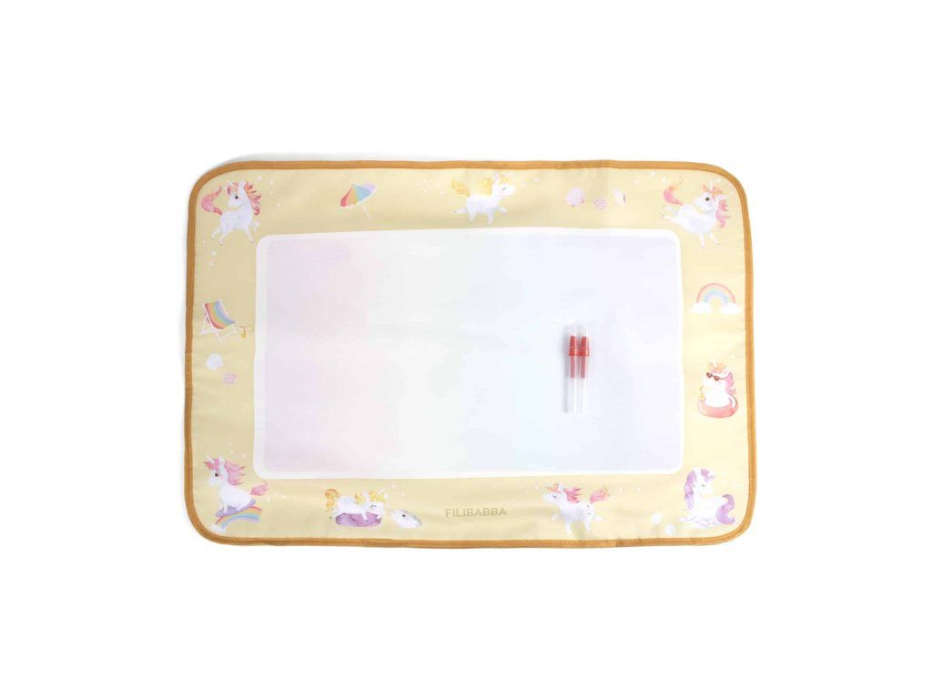 Tichý moment, jemný dotyk vody – a zrazu farby rozkvitnú ako mágiou. Táto snová vodná maliarska podložka umožňuje malým umelcom sledovať, ako ich fantázia ožíva v jemných dúhových odtieňoch – bez neporiadku a škvŕn. Nie sú potrebné farby ani fixky – stačí naplniť jedno z dvoch priložených pier vodou a sledovať, ako sa farby objavujú. Pokojný a hravý spôsob, ako objavovať kreativitu stále dookola. Podložka je dostatočne veľká na to, aby na nej mohli kresliť dve deti naraz. Keď kresba uschne, povrch je opäť pripravený na nové umelecké dobrodružstvá. Je ľahká a jednoducho skladateľná s praktickým popruhom – ideálna na doma aj na cesty, od obývačky až po slnečný piknik. Objavte tento čarovný vzor. Očarujúce jednorožce sa kĺžu po dúhach a jemne tancujú medzi vlnami, zatiaľ čo zvedavý malý narval vykukuje z trblietavého mora. Na jemnom žltom pozadí sa rozvíja snový letný svet plný fantázie a úžasu. Základné vlastnosti:- Rozmery: 70 × 55 cm