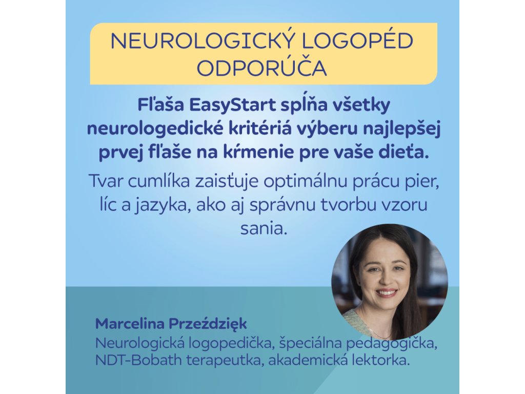 „Fľaša EasyStart spĺňa všetky neurologopedické kritériá pre výber najlepšej prvej dojčenskej fľaše pre vaše dieťa. Tvar cumlíka umožňuje optimálne fungovanie pier, tvárí a jazyka a tiež správnu tvorbu vzoru sania.