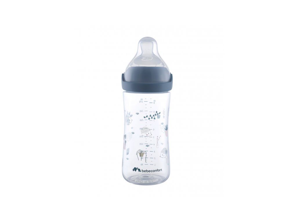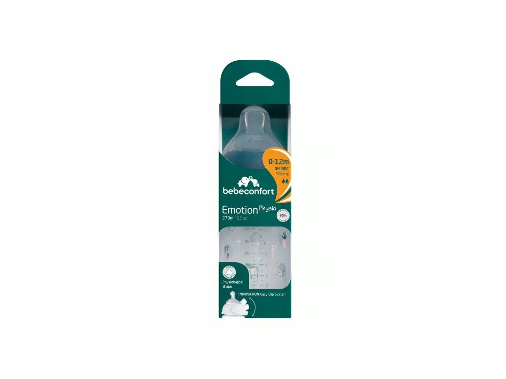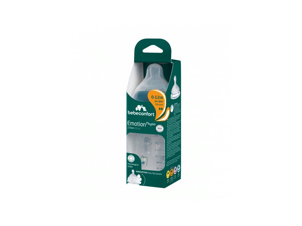 Dojčenská fľaštička Bebeconfort Emotion Physio s unikátnym silikónovým cumlíkom fyziologického tvaru je zárukou, že dieťa takmer nepociťuje rozdiel medzi dojčením a kŕmením z fľaštičky. Fľaštička je antikoliková, vybavená dvojitým ventilačným systémom na okraji cumlíka, ktorý citlivo zabezpečí únik vzduchu z fľaše, tým umožní plynulé sanie tekutiny a zároveň znižuje riziko brušnej koliky.