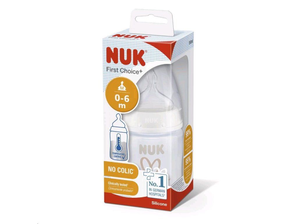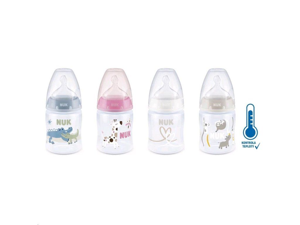 Dojčenská fľaša NUK First Choice s kontrolou teploty. Špeciálny tvar typický pre cumlík NUK s ortodontickým antikolikový cumlíkom je modelovaný podľa materskej bradavky pri dojčení. Dojčenské fľaše sú teraz vybavené novou NUK kontrolkou teploty a pomáhajú tak zabrániť tomu, aby vaše dieťa pilo príliš horúci príkrm. Kontrolka vyzerá ako teplomer, je umiestnená medzi ryskami a teplota obsahu fľaše zmení jej farbu. Ak je príkrm príliš horúci, modrá kontrolka sa zmení na bielu. Vyrobená z vysoko kvalitného nerozbitného plastu polypropylénu a neobsahuje BPA (Bisfenol A). Obsah fľaše 150 ml. Vhodná pre deti od 0-6 mesiacov M (stredne veľký otvor = pre detskú výživu). Klinicky testované.Charekteristika: