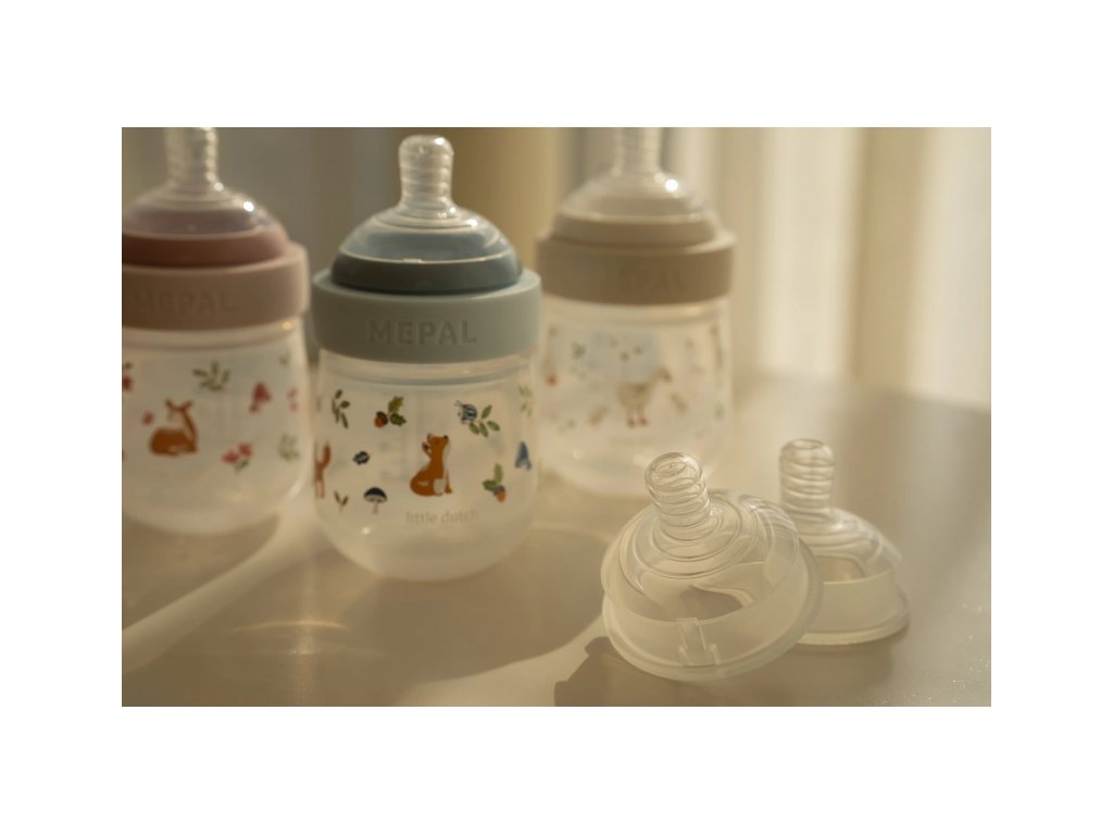 Sada dojčenských fliaš Little Dutch s krásnou potlačou a cumlíkom s antikolikovým ventilom obsahuje dve fľaše (165 ml a 240 ml) so cumlíkom s pomalým prietokom, vhodné pre deti od narodenia, a dva cumlíky so stredným prietokom, vhodné pre deti od 3 mesiacov.