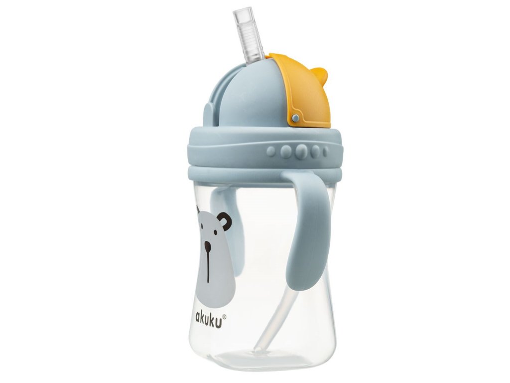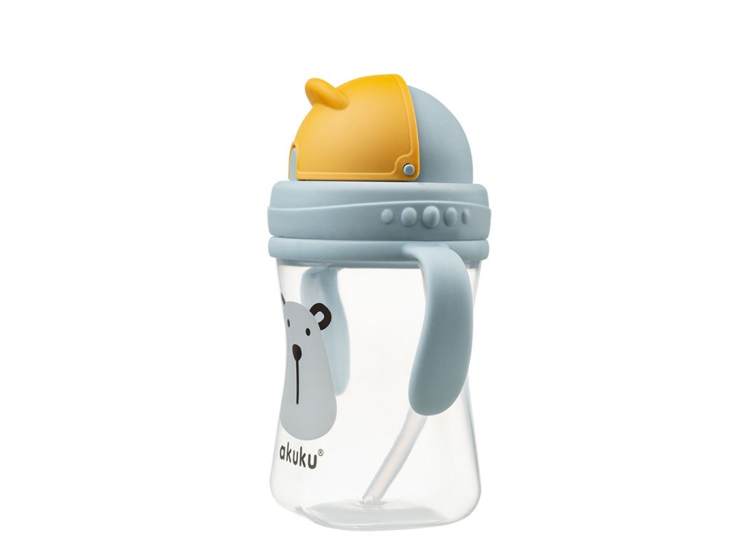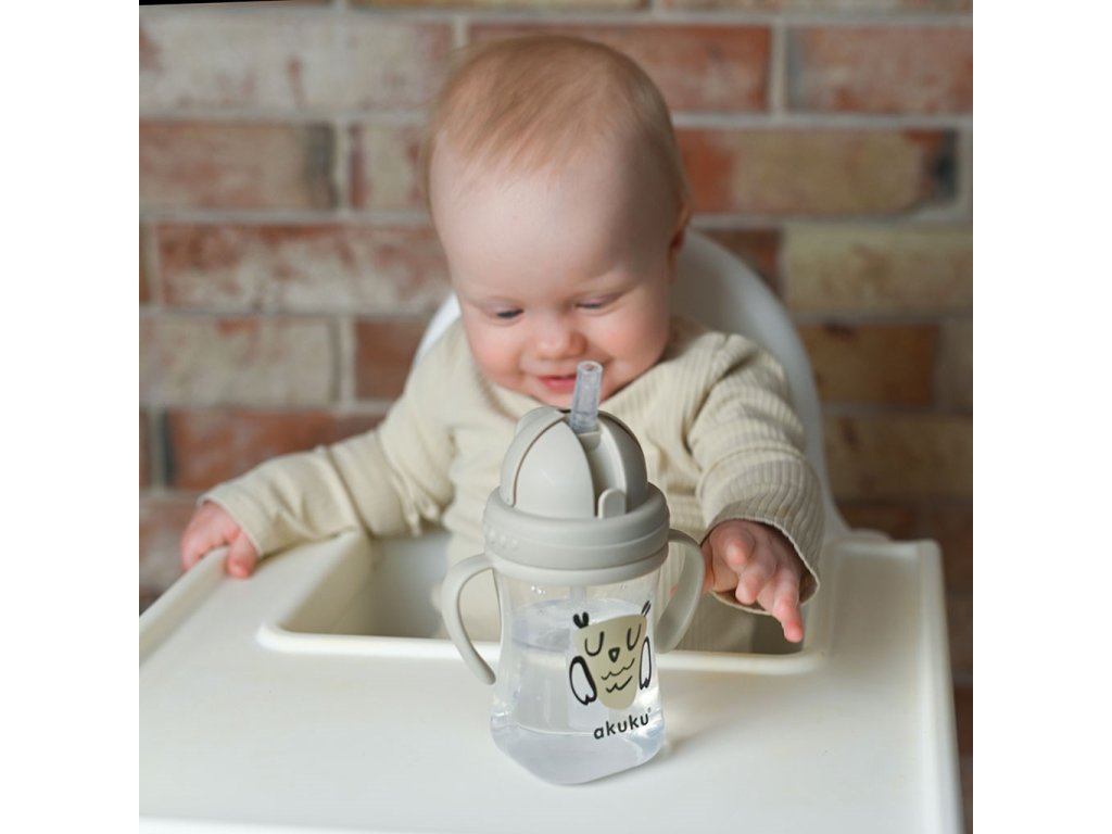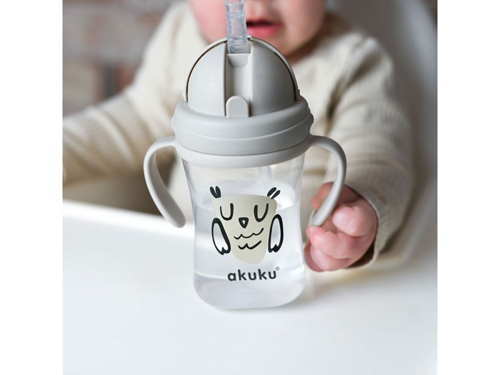 Flaša so slamkou "akuku" je vhodná na doma, cestovanie alebo prechádzky. Ideálna na učenie pitia. Ľahko sa udržiava v čistote. Priehľadná farba umožňuje jednoduchú kontrolu obsahu. Špeciálny ergonomický tvar poskytuje veľký komfort počas používania. Hrnček je vybavený pohodlnými širokými držadlami, vďaka ktorým sa ľahko drží v drobných ručičkách.