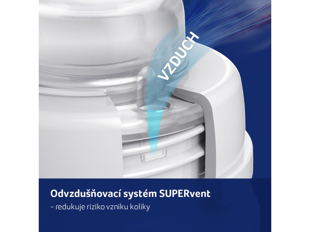 Systém odvzdušňovania SUPER air vent Anti-colic - nový, efektívny odvzdušňovací systém SUPER VENT zabraňuje zmiešaniu mlieka so vzduchom. Týmto spôsobom sa zníži riziko koliky.