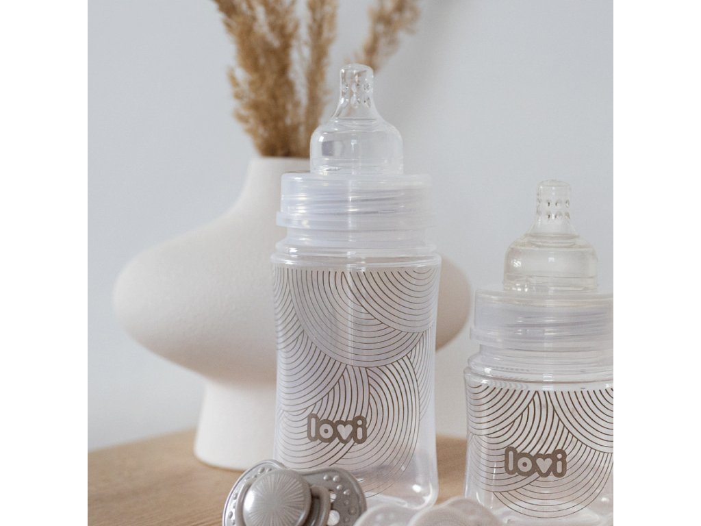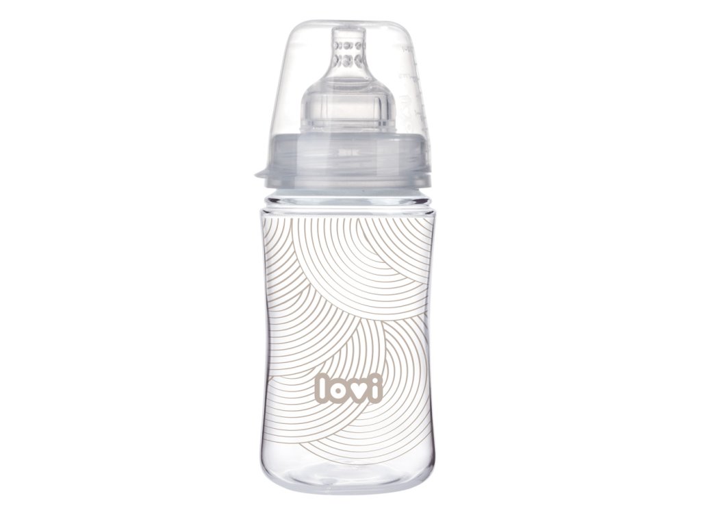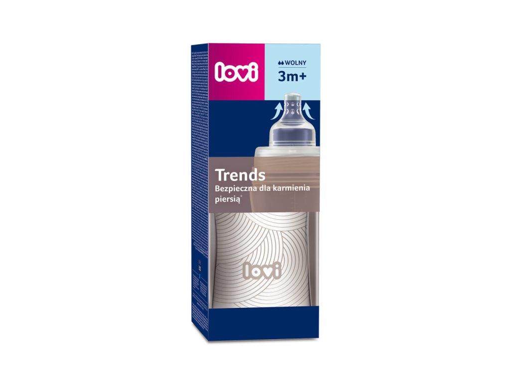 LOVI Fľaša Trends na kŕmenie detí odsatým mliekom od matky. Bezpečné pre dojčené dieťa, nenarúša sací reflex a nenarúša prirodzené kŕmenie. Je vybavená unikátnym cumlíkom na kŕmenie® s tenkým, vyčnievajúcim zakončením, tvrdou, profilovanou základňou a systémeom odvodu vzduchu SUPERvent. Fĺaša je kompatibilná so všetkými odsávačkami LOVI. LOVI Fľaše Trends je potlačená jemným dizajnom v súlade s najnovšími trendmi.