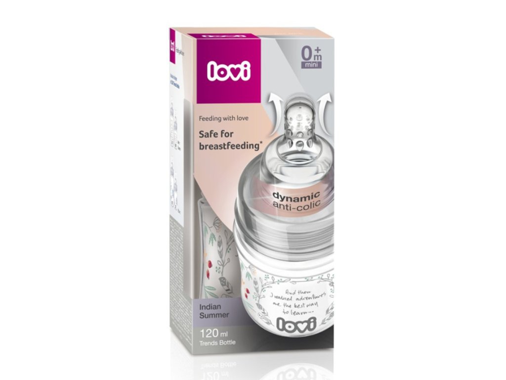 LOVI fľaše Trends na podávanie odsatého materského mlieka dieťaťu. Potlač po obvode fľaše je navrhnutá podľa najnovšách trendov. Fľaša je vybavená unikátnym Dynamickým cumlíkom® s tenkým, naťahujúcim sa koncom, širokou, tvrdou, profilovanou základňou a antikolikovým systémom odvádzania vzduchu SUPERvent. Dostupná v dvoch kolekciách: Indian Summer a Botanic. Fľaša je kompatibilná so všetkými prsnými odsávačkami LOVIUPOZORNENIE: Značka LOVI odporúča dojčenie ako najzdravší spôsob kŕmenia. Náhradné podávanie pokrmu by malo byť zavedené až po konzultácií s lekárom, pôrodnou asistentkou, alebo lekárnikom, ak dojčenie nie je možné, alebo je nedostatočné.