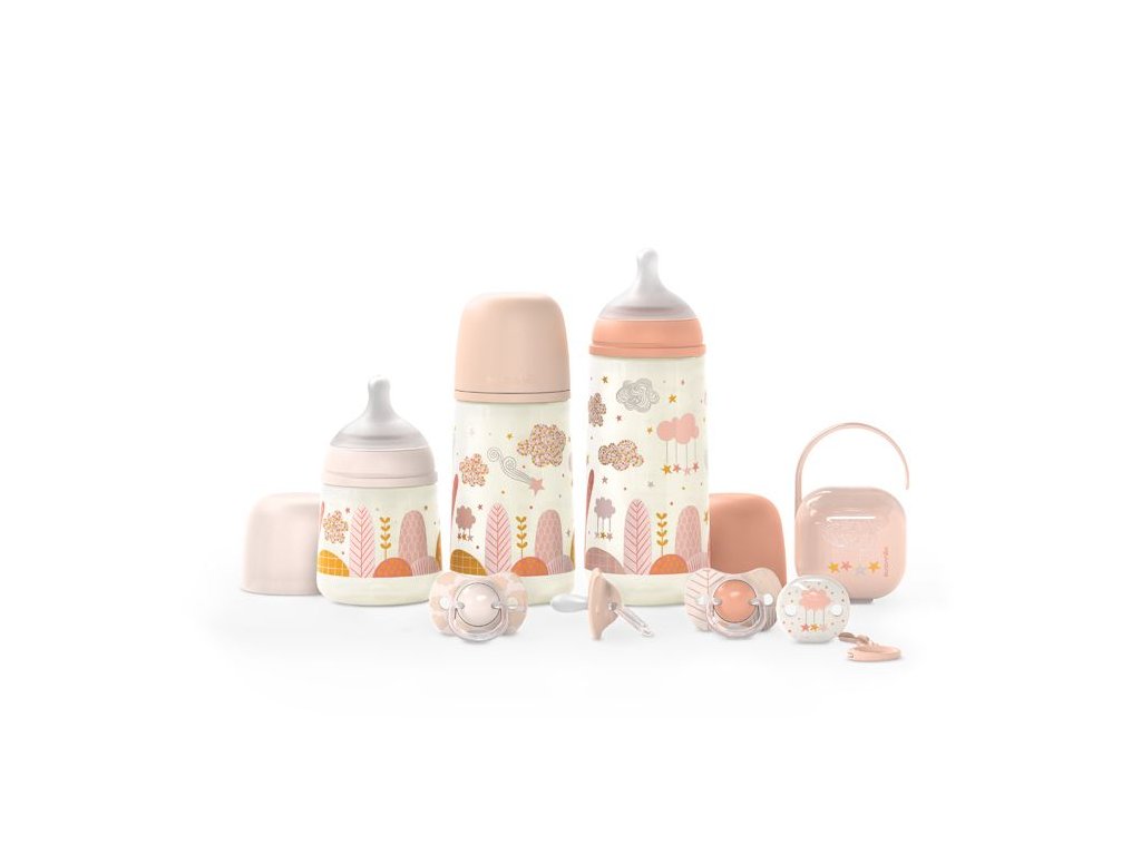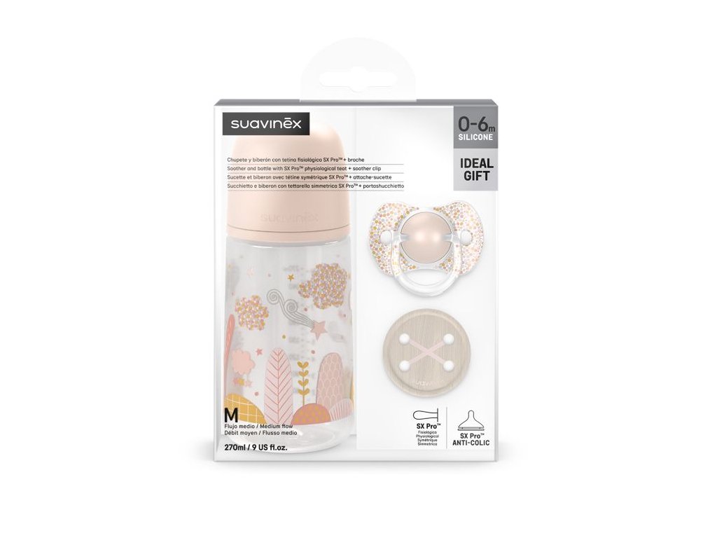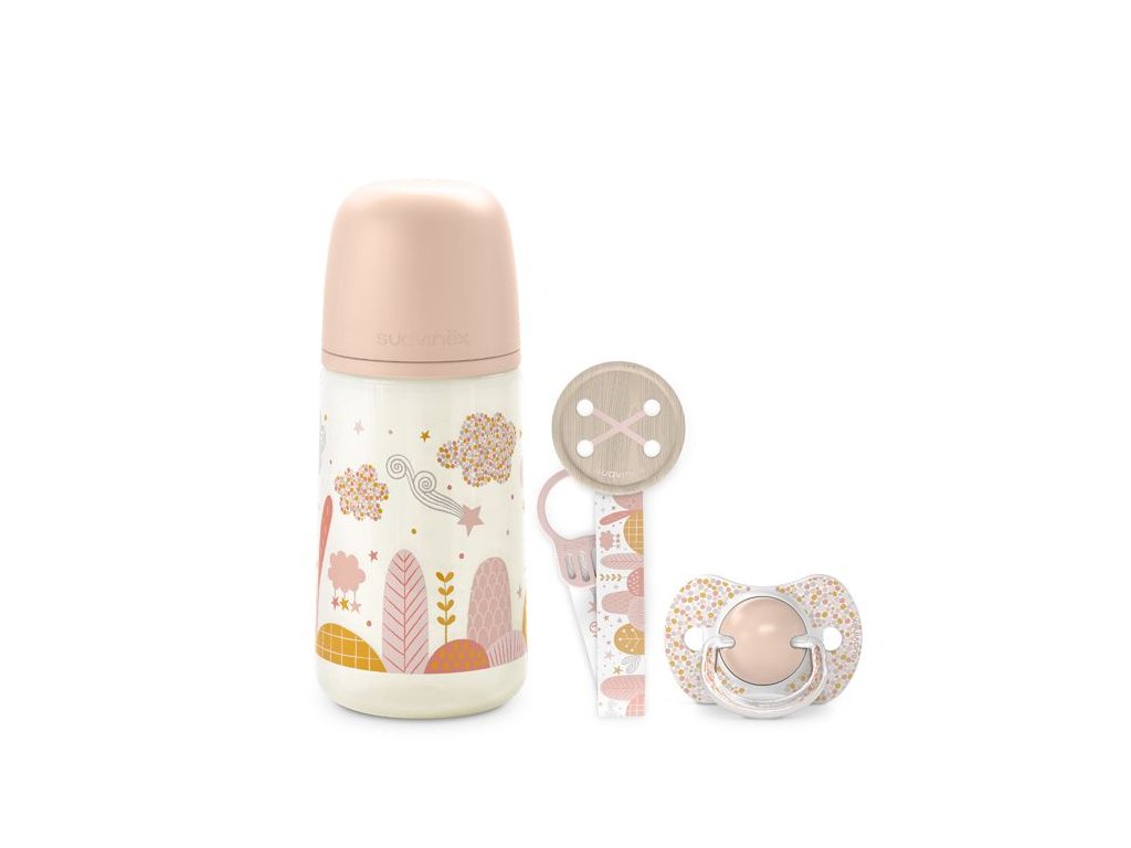 SUAVINEX | Sada fľaša 270ml + cumlík fyziologický 0/6m + klip Dreams - ružová