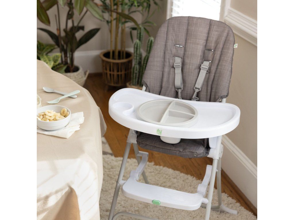 Ušetrite miesto vo svojom dome a doprajte dieťaťu vynikajúci zážitok z jedla s kompaktnou skladacou vysokou stoličkou ity by Ingenuity Sun Valley. Ľahká, moderná vysoká stolička má kompaktný dizajn pre ľahké skladovanie a prenosnosť. Táto štíhla stolička sa dá zložiť naplocho a keď je zložená, sama stojí.Je to jediná vysoká stolička, ktorá ponúka tanier na podporu schopností dieťatka pri samokŕmení. Jedinečný 3-dielny tanier Twist & Dine sa bezpečne uzamkne na svojom mieste, aby ho malé deti nehodili na zem, a je vhodný do mikrovlnnej rúry pre jednoduchú prípravu jedla. Ako dieťa rastie, veľký pultík sa nastavuje do 3 polôh. Pultík sa pri skladovaní pripevňuje k operadlu stoličky. Sedacia podložka je umývateľná v práčke. 5-bodové bezpečnostné pásy zaisťujú bezpečnosť dieťaťa.