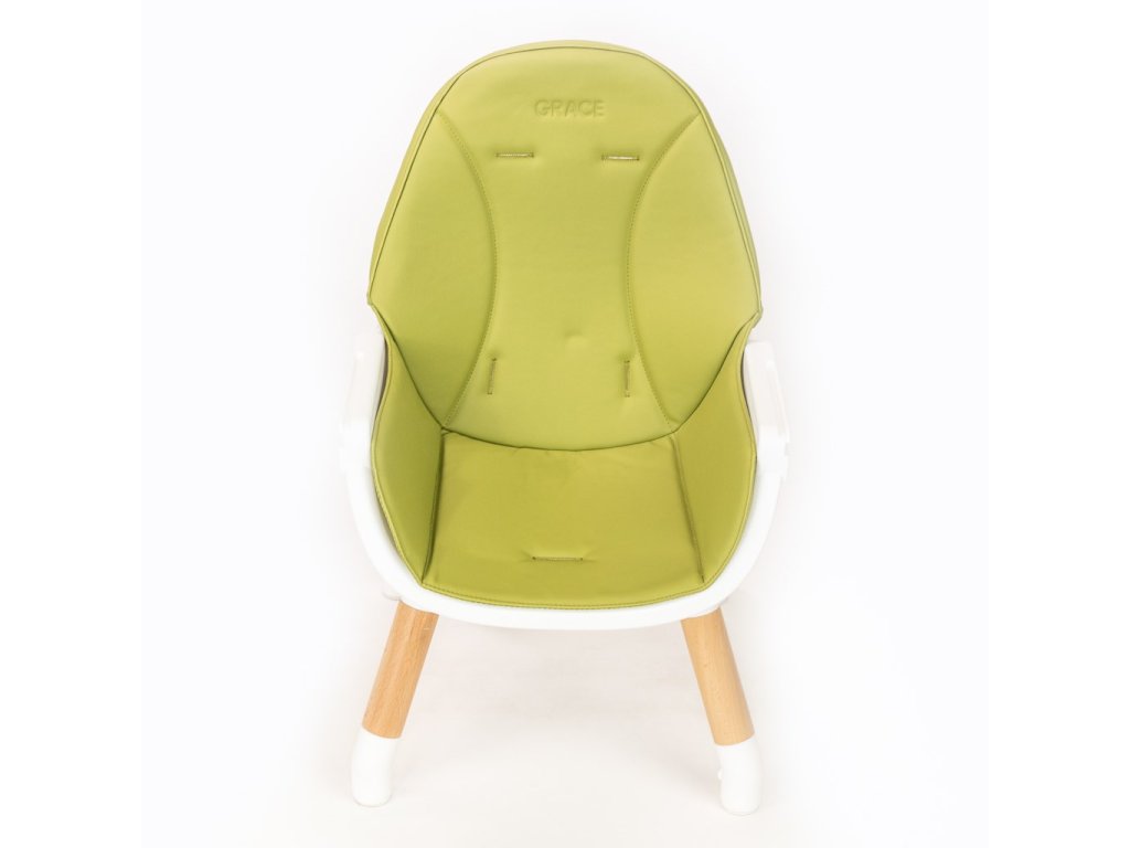 Stolička je vybavená bezpečnostnými pásmi s mäkkými ramennými vypchávkami chráni dieťa pred odreninami. Čalúnenie je vyrobené z ekokože, ktorá je odolná voči nečistotám a ľahko sa udržuje v čistote - stačí ju vyčistiť vlhkou handričkou a jemným saponátom. Tácka má priehlbinu, ktorá zabraňuje skĺznutiu predmetov a dva otvory, do ktorých je možné umiestniť fľašu alebo hrnček. Stolička Grace má ľahkú a stabilnú konštrukciu. Nohy majú gumové nôžky, vďaka ktorým je stolička chránená proti posunutiu.Vysokej stoličky je určená pre deti od 6 mesiacov do 36 mesiacov max 15 kg a verzia nízkej stoličky plus stôl pre deti od 3 do 6 rokov alebo hmotnosti 25 kg.