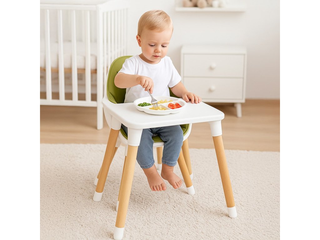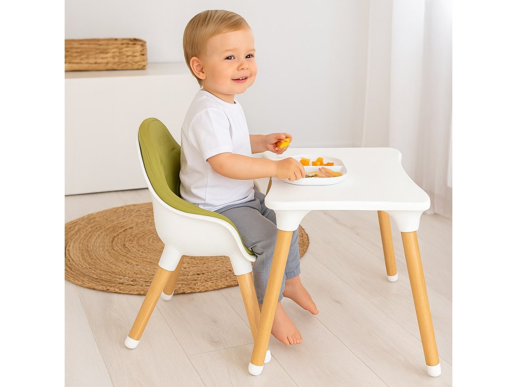 -Jedálenská stolička, ktorá kombinuje 3 funkcie: vysoká a nízka jedálenská stolička alebo set stola a stoličky.