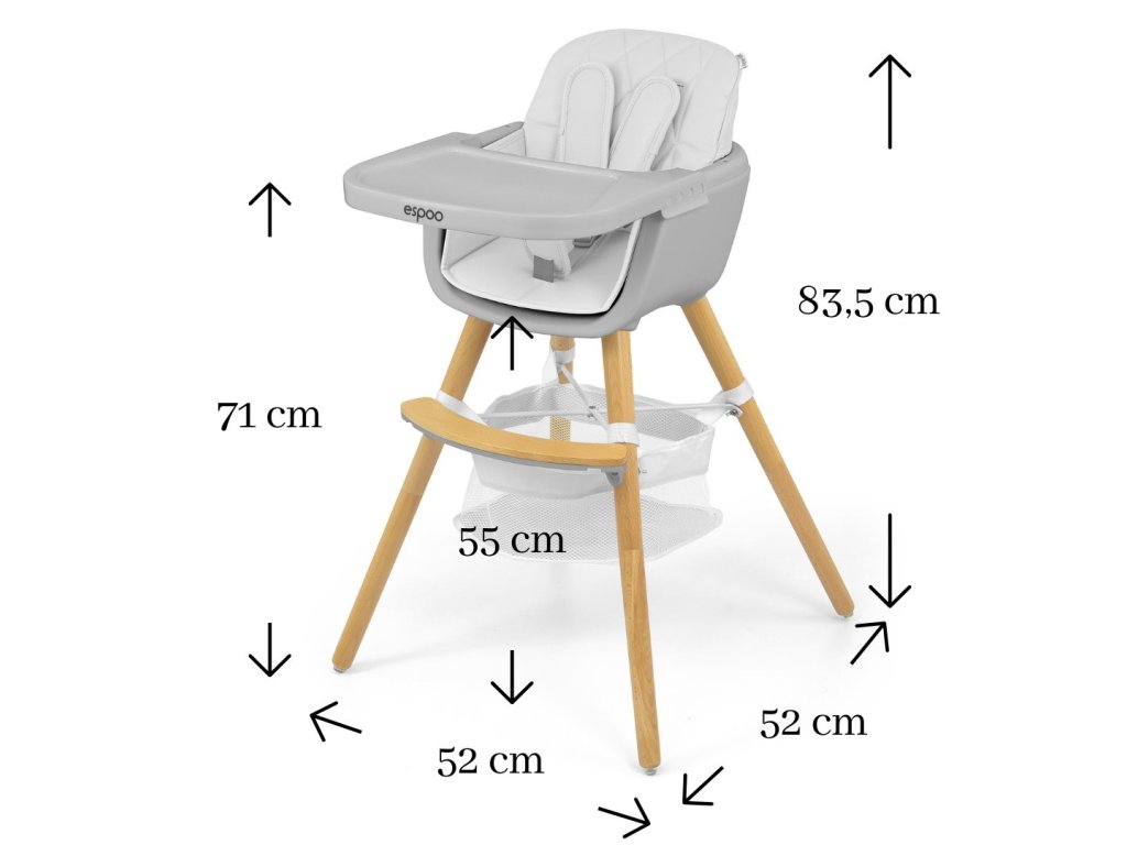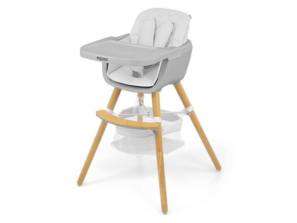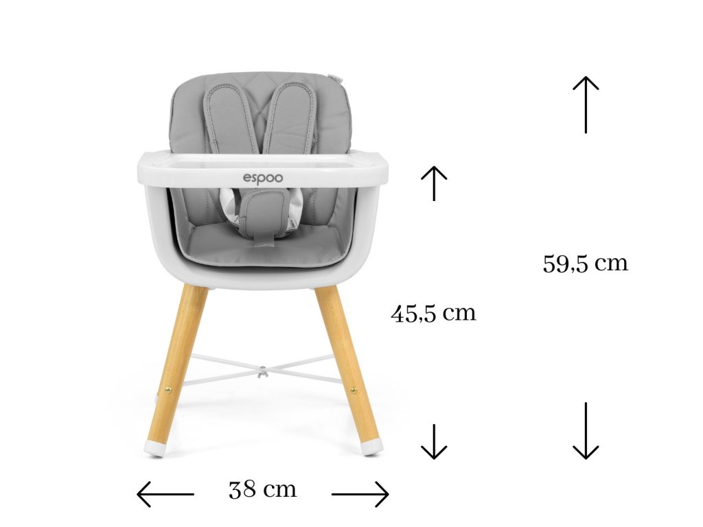 Moderná a štýlová jedálenská stolička Espoo je vyrobená z najkvalitnejších materiálov a kombinuje funkčnosť a moderný dizajn. Je určená deťom od 6 mesiacov do 5 rokov alebo hmotnosti do 15 kg. Espoo je dokonalým riešením pre tých rodičov, pre ktorých sú najdôležitejšie pohodlie a bezpečnosť a zároveň dizajn a minimalizmus.
