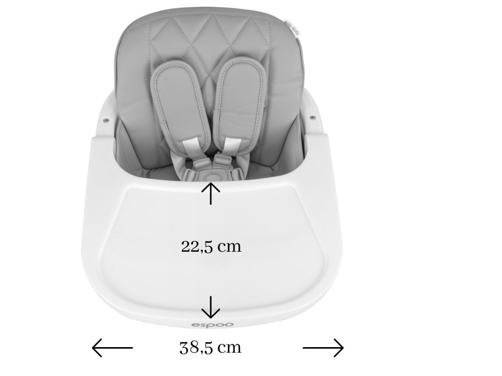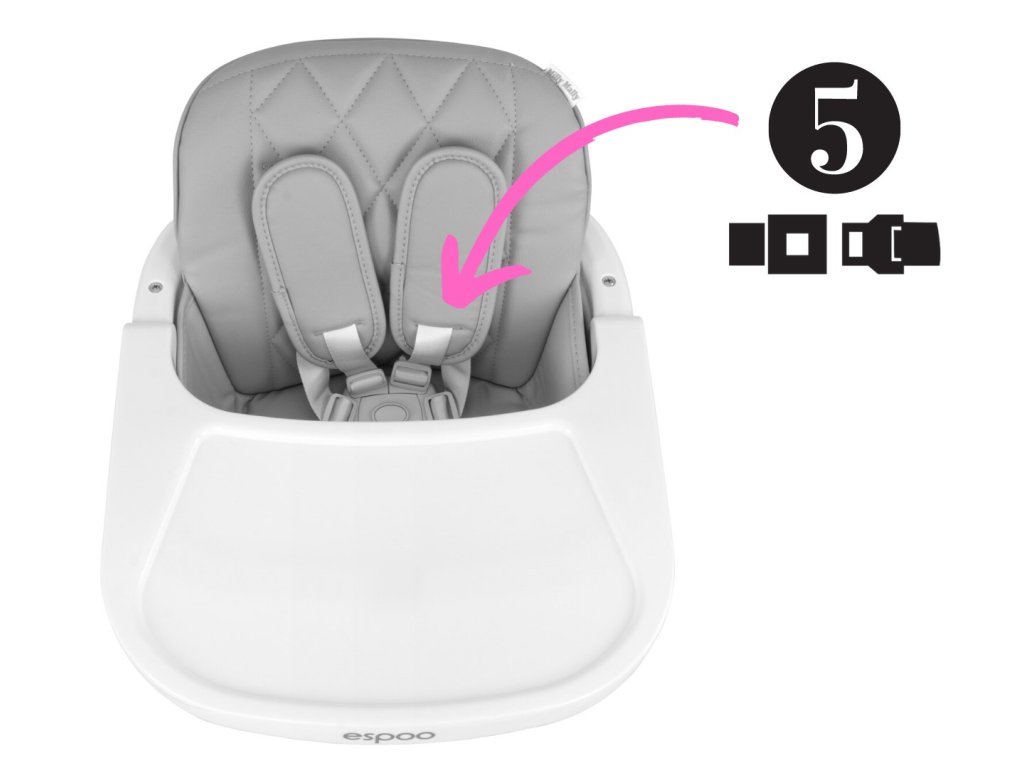 Stoličku je možné prispôsobiť veku a výške dieťaťa, umožňujú to nastaviteľné päťbodové bezpečnostné pásy. Sú vybavené širokými a mäkkými chráničmi ramien. Čalúnenie stoličky Espoo je vyrobené z ekokože, je odolné proti zašpineniu a ľahko sa čistí. Tácka má zvýšené okraje, ktoré lepšie bránia pádom predmetov na zem.
