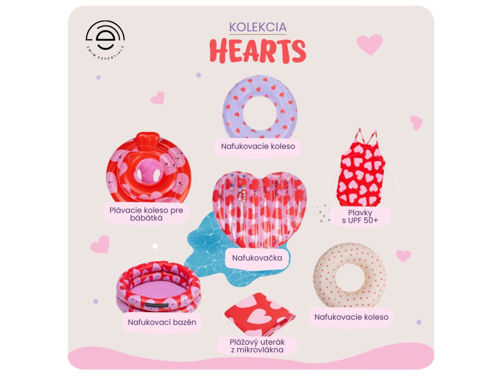 Nafukovacie koleso pre bábätká Swim Essentials Hearts s jemným motívom srdiečok je navrhnuté tak, aby bábätko mohlo spoznávať vodu pohodlne a bezpečne.