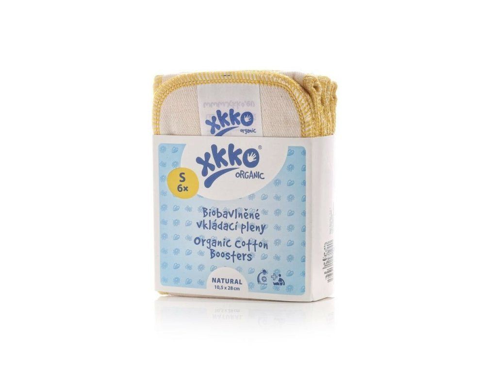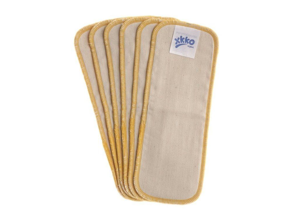 „Biobavlněné vkladacie plienky vyrobené z bavlneného kepra s certifikátom GOTS. Biobavlněné vkladacie plienky XKKO Organic sú ušité z osmi (!) vrstiev biobavlneného kepra. Plienky získavajú optimálnu savosť po 4-8 praniach. Prirodzenou vlastnosťou neupravené bavlny je zrážanlivosť, bežne udávaná hodnota zrážanlivosti plienok je okolo 10%.“ Vkladacie plienky využijete v prípade, že potrebujete zvýšiť absorpciu plienkového systému, ktorý používate – napríklad na noc. Môžete ich použiť ku klasickým štvorcovým plienkam, skladaným plienkam, prípadne plienkovým nohavičkám. K týmto plienkovým systémom je vždy potrebné použiť aj vrchné plienkové nohavičky.