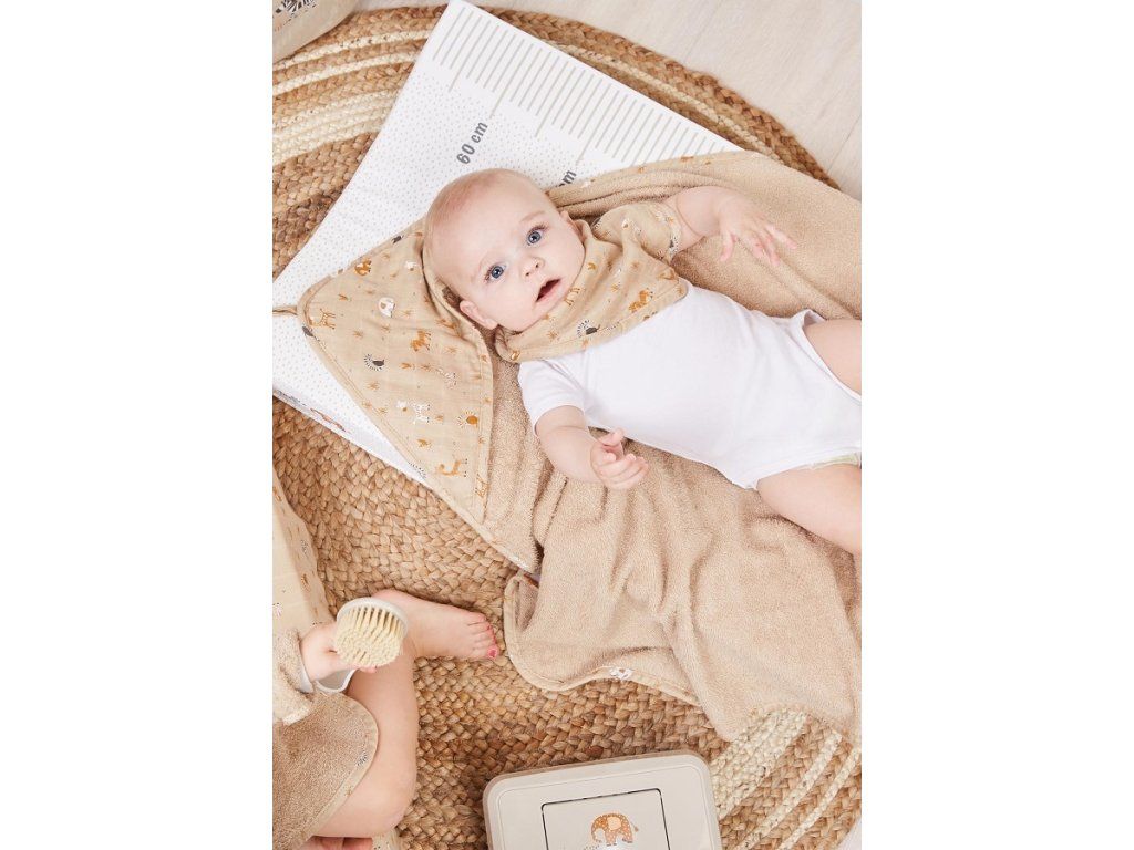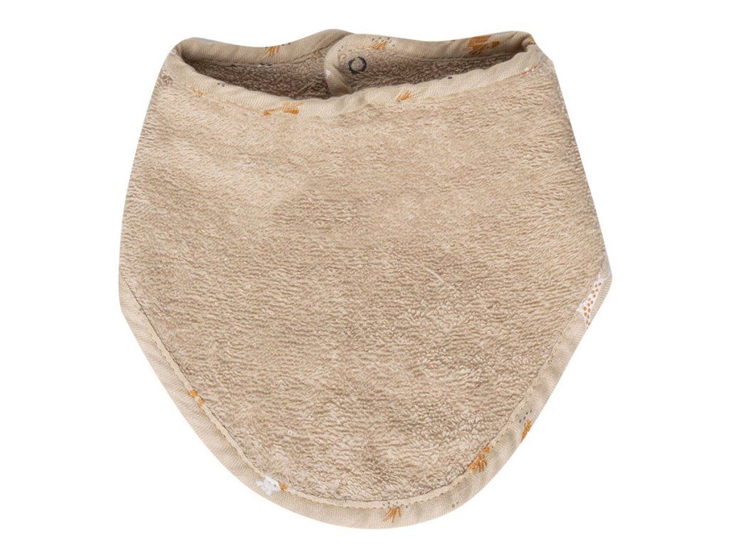 Tento béžový módny slintáčik-bandana z bavlneného froté, môže vaše dieťa nosiť po celý deň. Super užitočné, keď potrebujete ochrániť oblečenie pri kŕmení alebo ak dieťa pri raste zubov viac sliní. Slintáčik má certifikáciu Öko-Tex a môže byť veľmi originálnym darčekom k narodeniu bábätka.