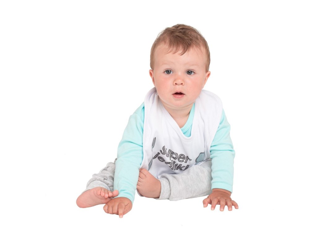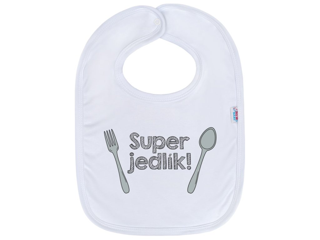 Krásny bavlnený detský podbradník s vtipným obrázkom New Baby. Podbradník je zdobený nápisom Super jedlík! Farby použité k potlači sú certifikované a vhodné pre bábätká. Je vyrobený z príjemného a kvalitného materiálu. Podbradník má biele lemovanie a je vyrobený z dvoch vrstiev bavlnenej látky. Zapínanie na cvoček. Detský podbradník chráni oblečenie bábätka pred znečistením pri jedle a pití. Zloženie: 100% bavlna. Rozmery: dxs cca 36x26 cm.Dodatočné parametre