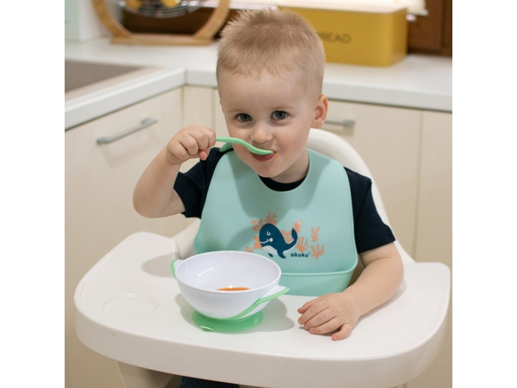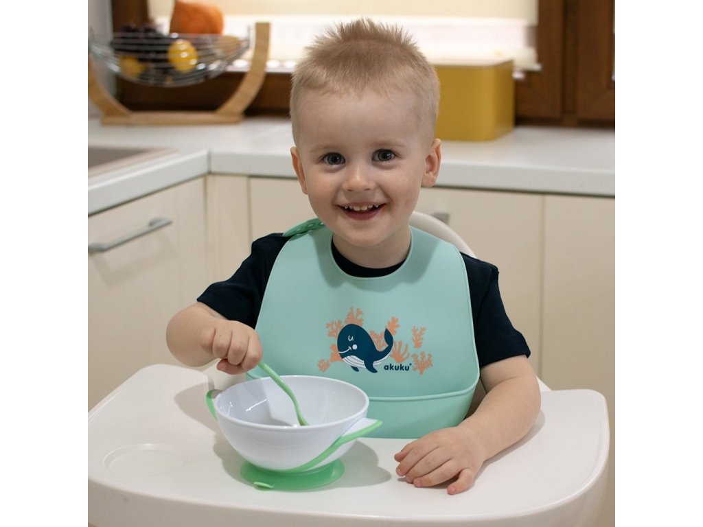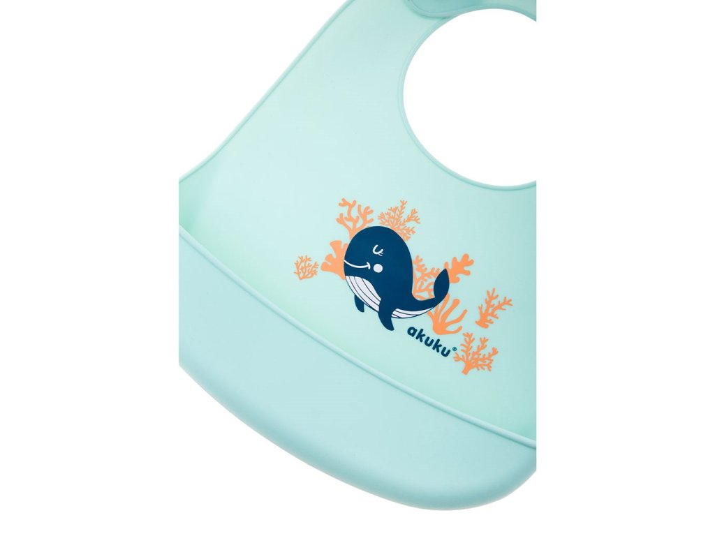 Nastaviteľný detský silikónový podbradník s vreckom Akuku veľryba mätový - 48485