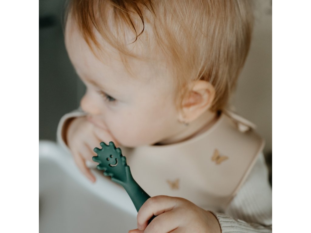 Podbradník je vyrobený z potravinárskeho silikónu bez obsahu BPA. Je určený pre malé deti od 6 mesiacov, ktorým sa zavádzajú prvé príkrmy, a pre tie, ktoré sa už úspešne učia samostatne jesť. Má nastaviteľné zapínanie, ktoré umožňuje prispôsobiť ho veľkosti krku dieťaťa. To znamená, že podbradník rastie spolu s dieťatkom. Vďaka ergonomickému tvaru a mäkkému materiálu sa podbradník pohodlne nosí a neobmedzuje pohyb dieťaťa pri jedení. Dá sa tiež zrolovať, a preto nezaberá veľa miesta v taške, keď idete na prechádzku alebo na výlet.
