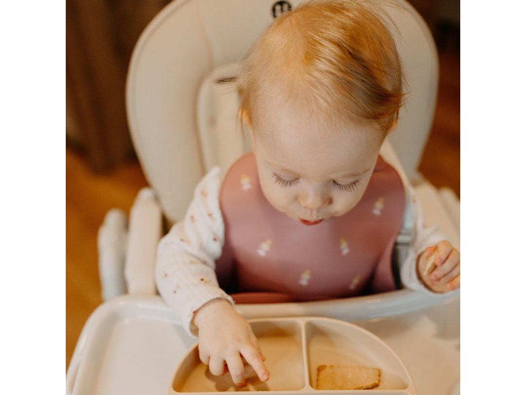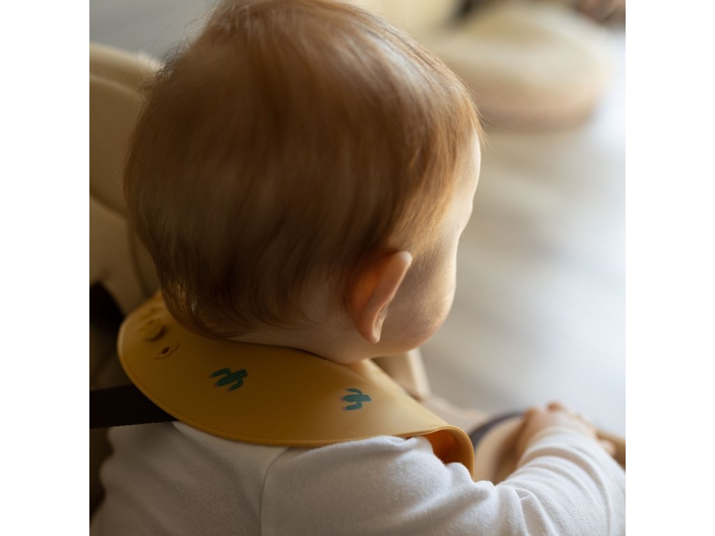 Podbradník je vyrobený z potravinárskeho silikónu bez obsahu BPA. Je určený pre malé deti od 6 mesiacov, ktorým sa zavádzajú prvé príkrmy, a pre tie, ktoré sa už úspešne učia samostatne jesť. Má nastaviteľné zapínanie, ktoré umožňuje prispôsobiť ho veľkosti krku dieťaťa. To znamená, že podbradník rastie spolu s dieťatkom. Vďaka ergonomickému tvaru a mäkkému materiálu sa podbradník pohodlne nosí a neobmedzuje pohyb dieťaťa pri jedení. Dá sa tiež zrolovať, a preto nezaberá veľa miesta v taške, keď idete na prechádzku alebo na výlet.