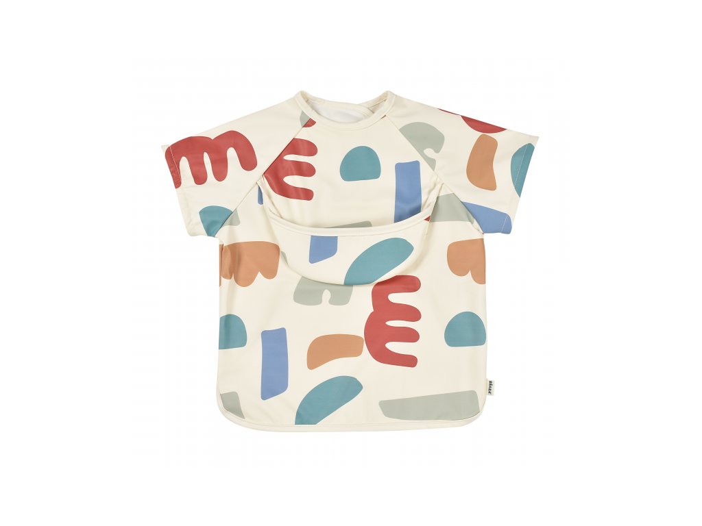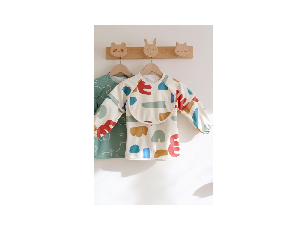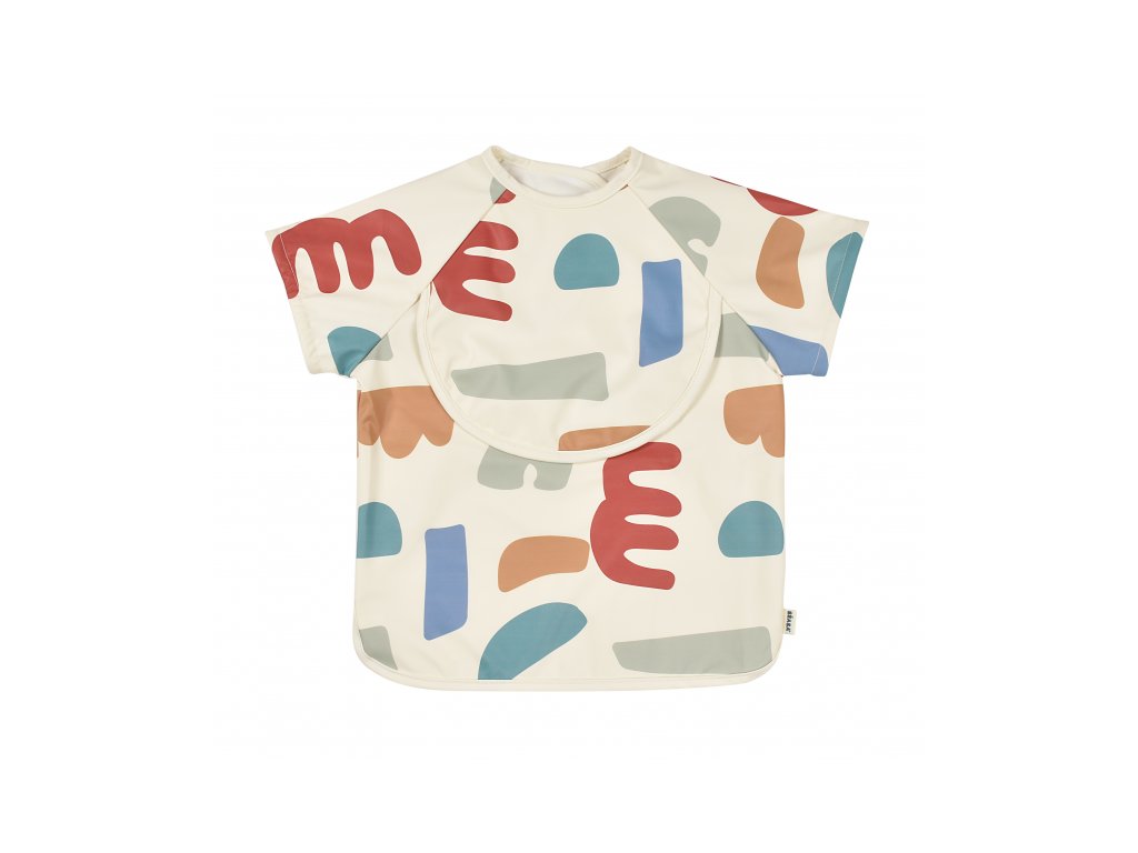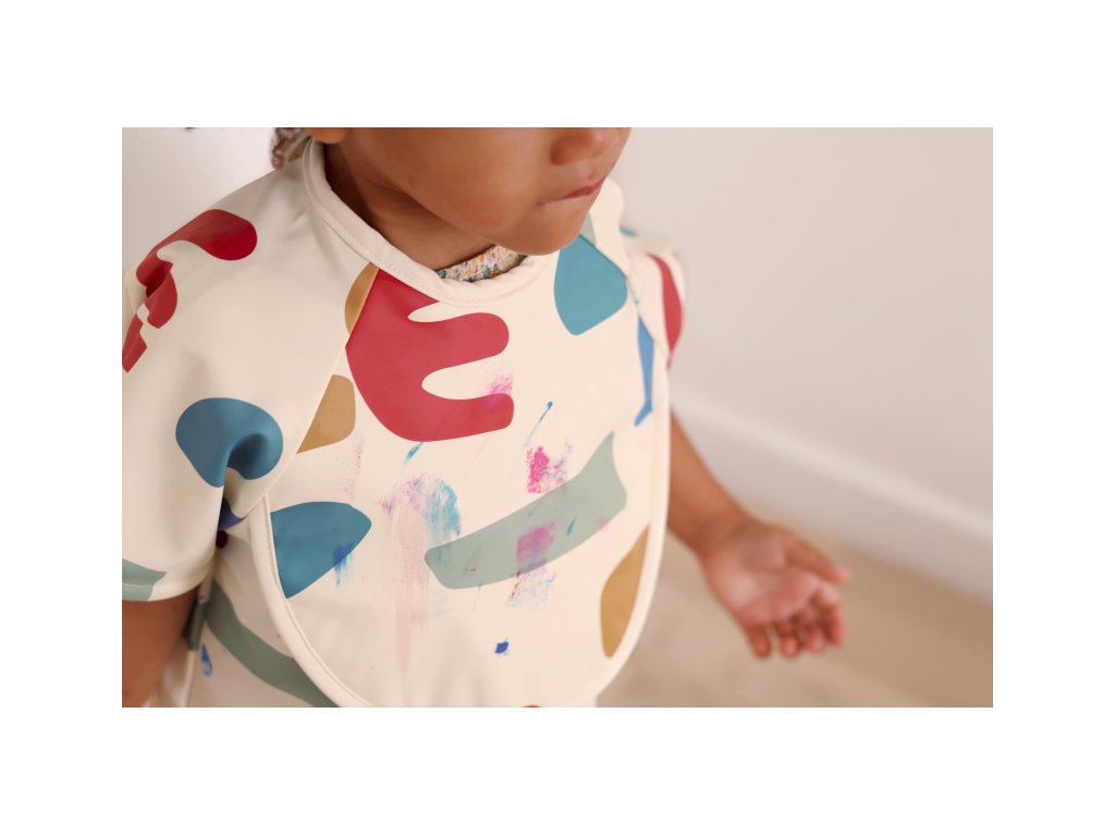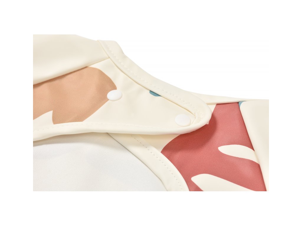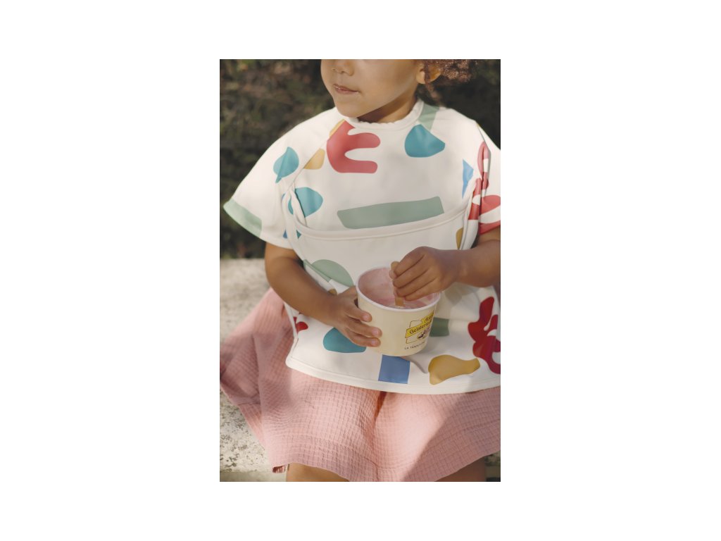 Podbradník s odnímateľnými rukávmi chráni detské oblečenie pri stolovaní aj výtvarných aktivitách. Rukávy je možné ľahko oddeliť aj znovu prirobiť. Rozkladacie vrecko na prednej strane pomáha zachytávať omrvinky aj kvapky pri detskom stolovaní, keď vrecko napr. pri maľovaní nepotrebujete, stačí ho nechať zložené.