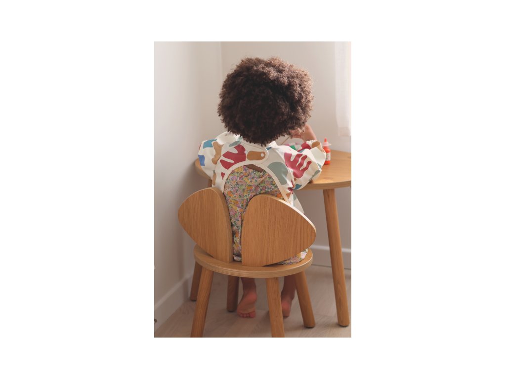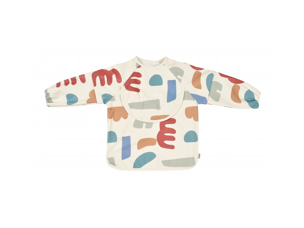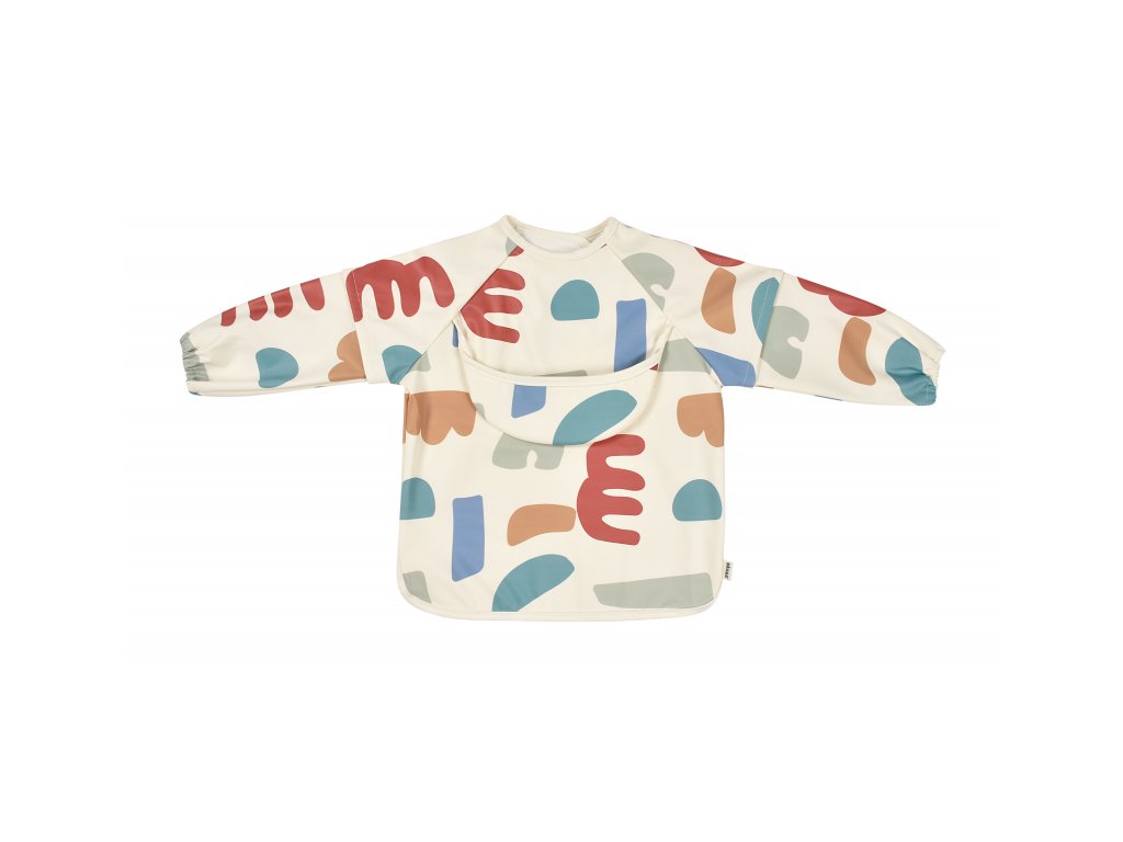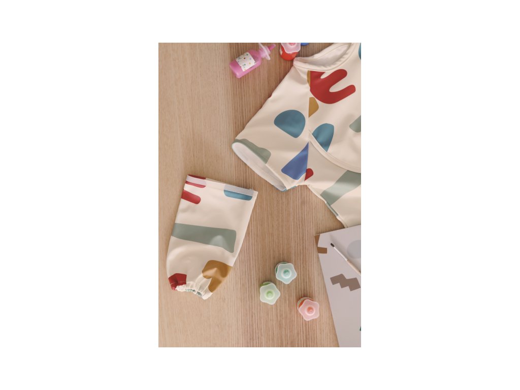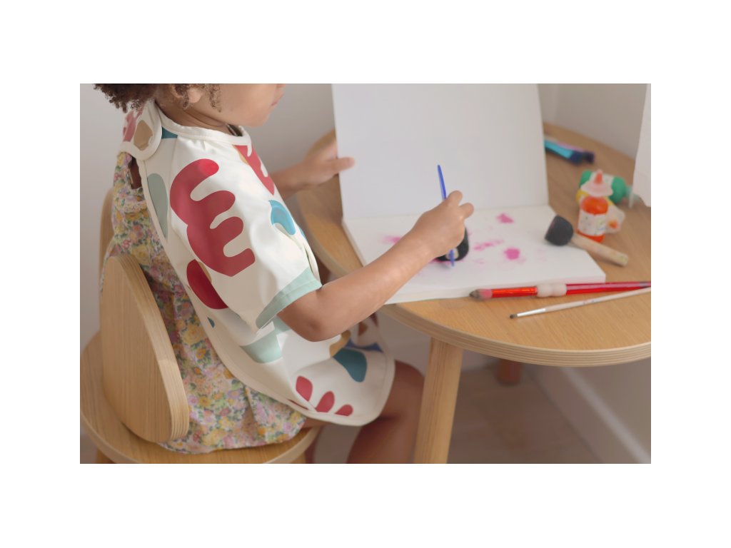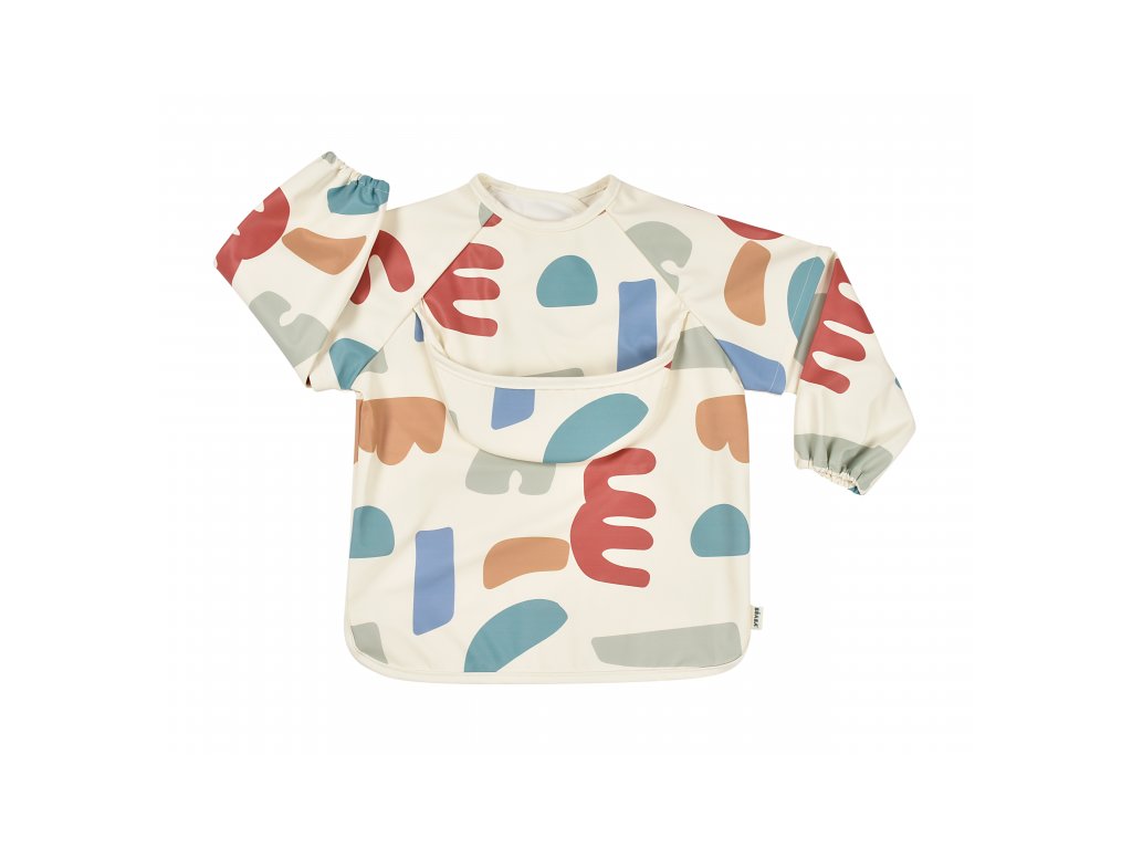 Podbradník s odnímateľnými rukávmi chráni detské oblečenie pri stolovaní aj výtvarných aktivitách. Rukávy je možné ľahko oddeliť aj znovu prirobiť. Rozkladacie vrecko na prednej strane pomáha zachytávať omrvinky aj kvapky pri detskom stolovaní, keď vrecko napr. pri maľovaní nepotrebujete, stačí ho nechať zložené.
