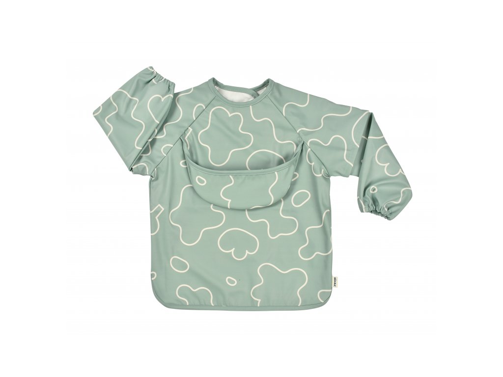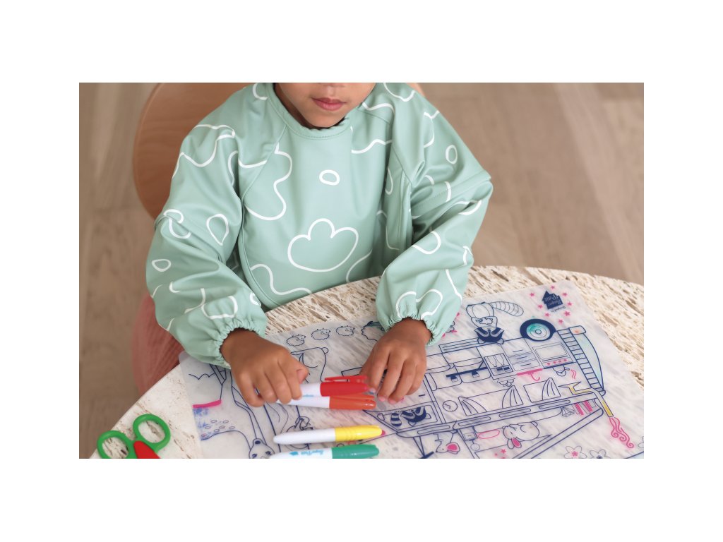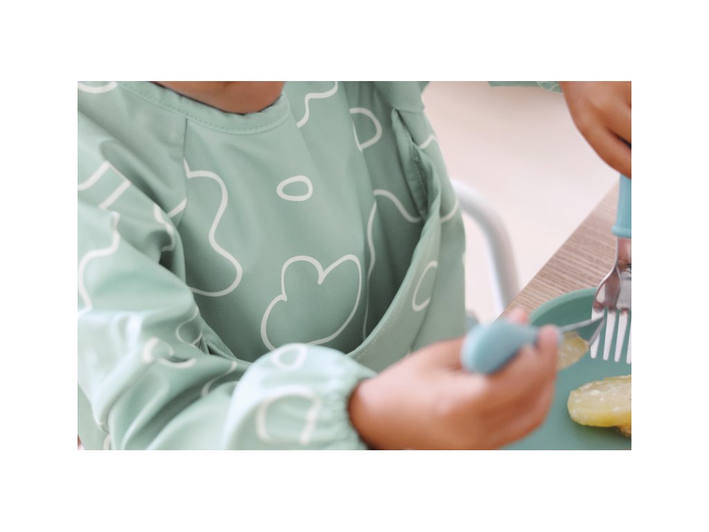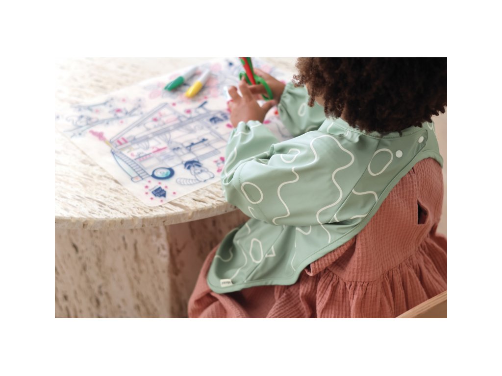 Podbradník s odnímateľnými rukávmi chráni detské oblečenie pri stolovaní aj výtvarných aktivitách. Rukávy je možné ľahko oddeliť aj znovu prirobiť. Rozkladacie vrecko na prednej strane pomáha zachytávať omrvinky aj kvapky pri detskom stolovaní, keď vrecko napr. pri maľovaní nepotrebujete, stačí ho nechať zložené.