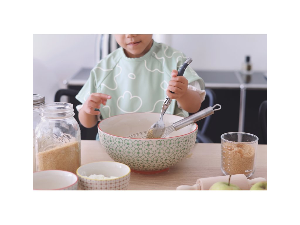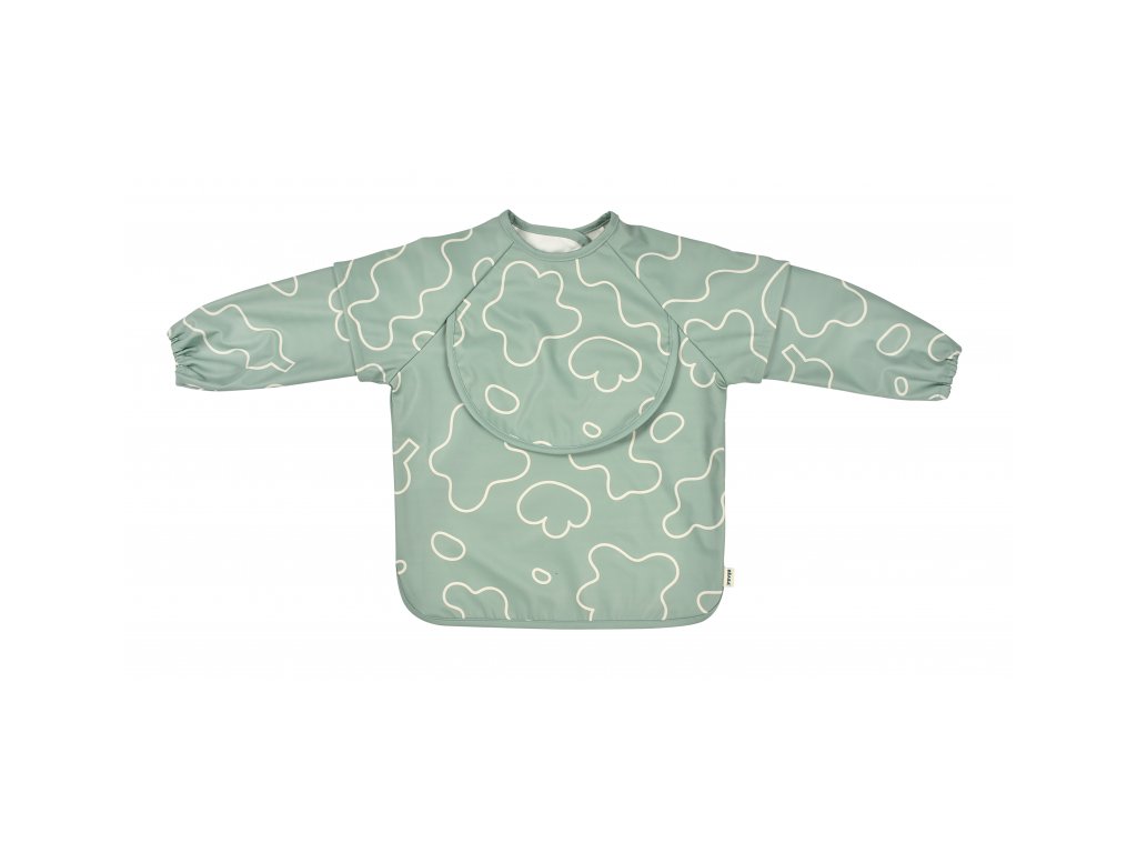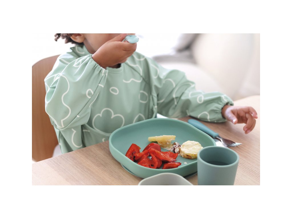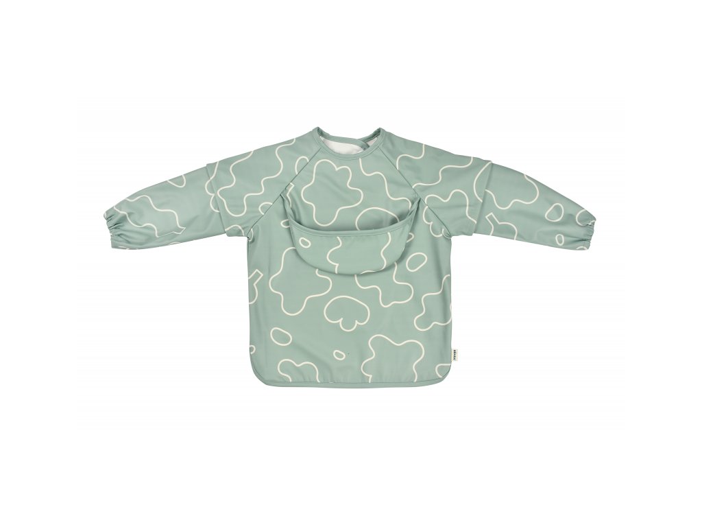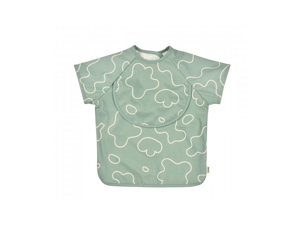 Podbradník s odnímateľnými rukávmi chráni detské oblečenie pri stolovaní aj výtvarných aktivitách. Rukávy je možné ľahko oddeliť aj znovu prirobiť. Rozkladacie vrecko na prednej strane pomáha zachytávať omrvinky aj kvapky pri detskom stolovaní, keď vrecko napr. pri maľovaní nepotrebujete, stačí ho nechať zložené.