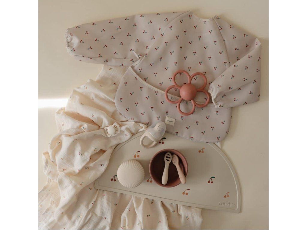 Podbradník s dlhým rukávom od značky Mushie pre bezproblémové jedenie!