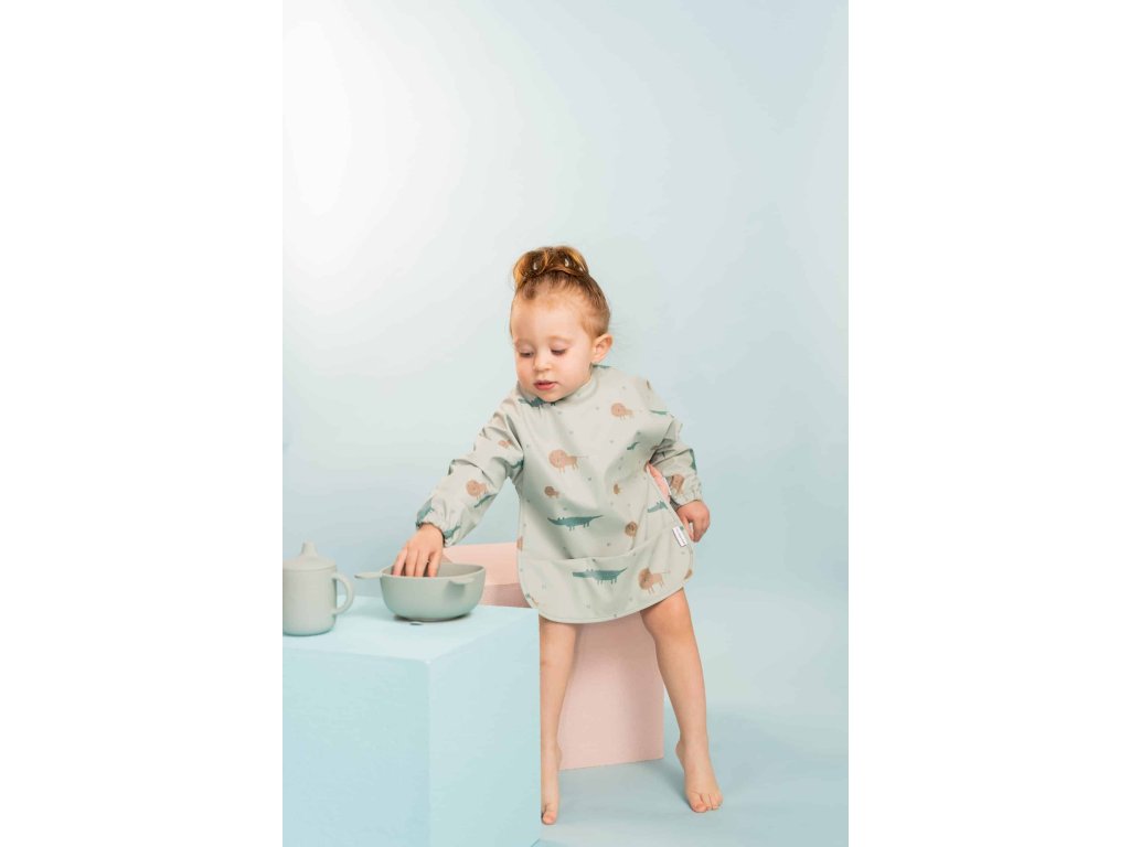 Podbradník je vyrobený z nepremokavej tkaniny, ktorá sa ľahko čistí, odoláva väčšine škvŕn a pachov. 100% recyklovaný Oeko-Tex polyester je nielen vodeodolný, ale je tiež možné ho umývať v práčke. Vodoodpudivý materiál robí tento všestranný podbradník nielen ideálnym na jedenie a kŕmenie, ale je tiež skvelý pre umelecké a remeselné projekty doma alebo v škôlke. Vstavané vrecko na zachytávanie pomáha udržať neporiadok pri jedle na minimum.- Vodeodolný