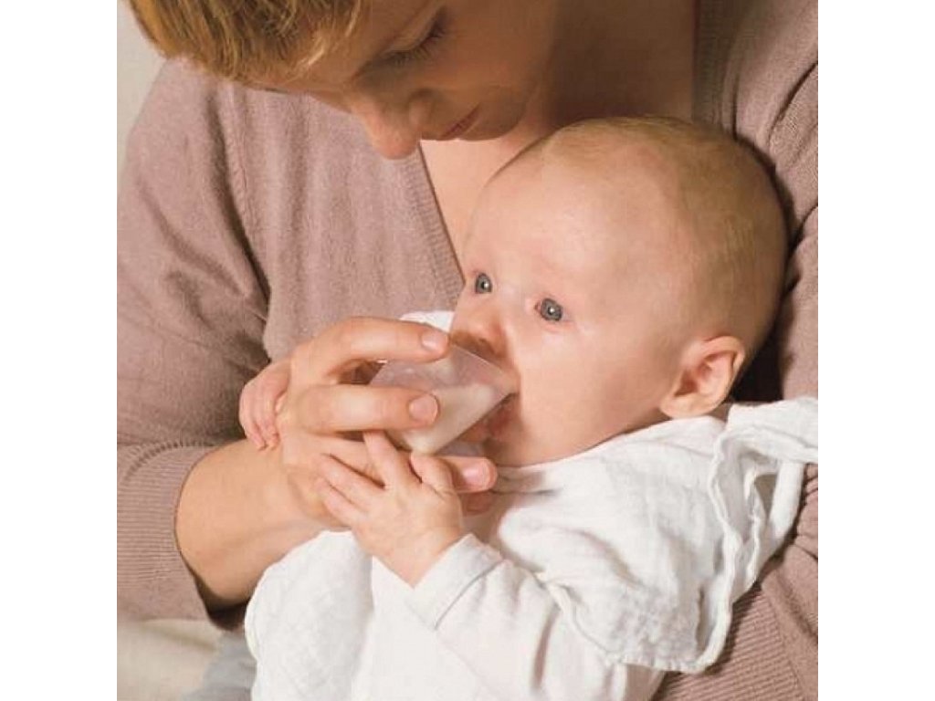 Pohár na podávanie materského mlieka.Pohár má odmerku, ktorá zaručuje, že môžete vždy kontrolovať množstvo mlieka, ktoré dieťa vypije. Použitie vyžaduje sústredenie, ale tiež zaručuje, že sacie reflexy nebudú narušené.