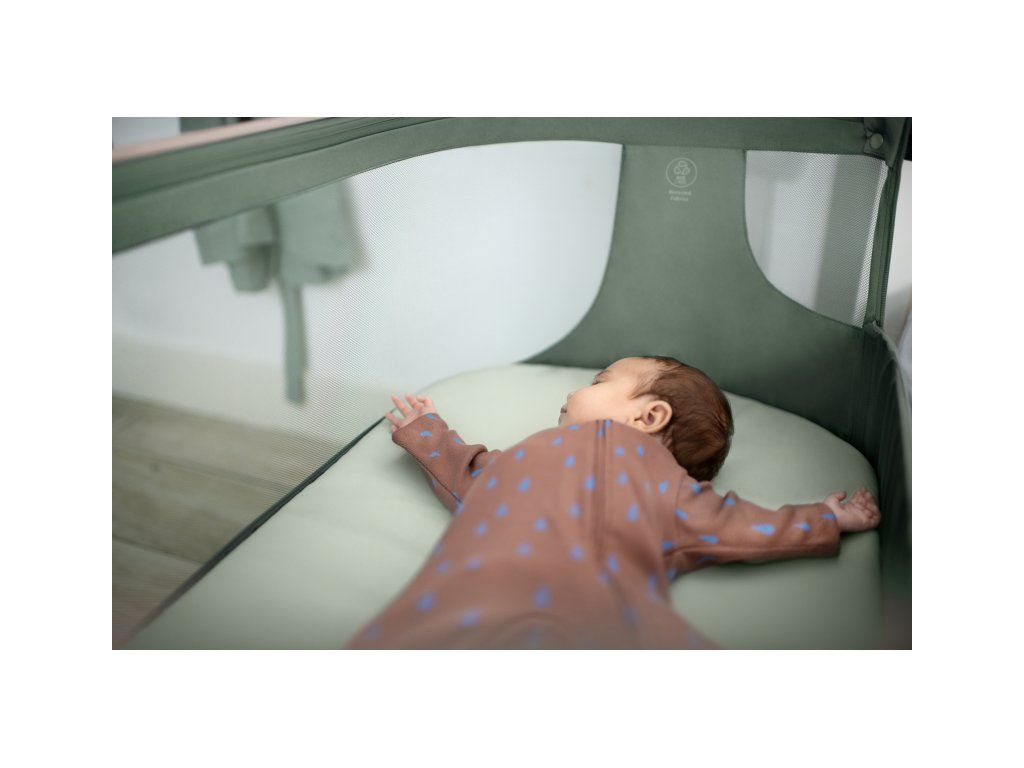 Textilné časti postieľky sú s ohľadom na udržateľnosť životného prostredia vyrobené zo 100% recyklovaných materiálov.