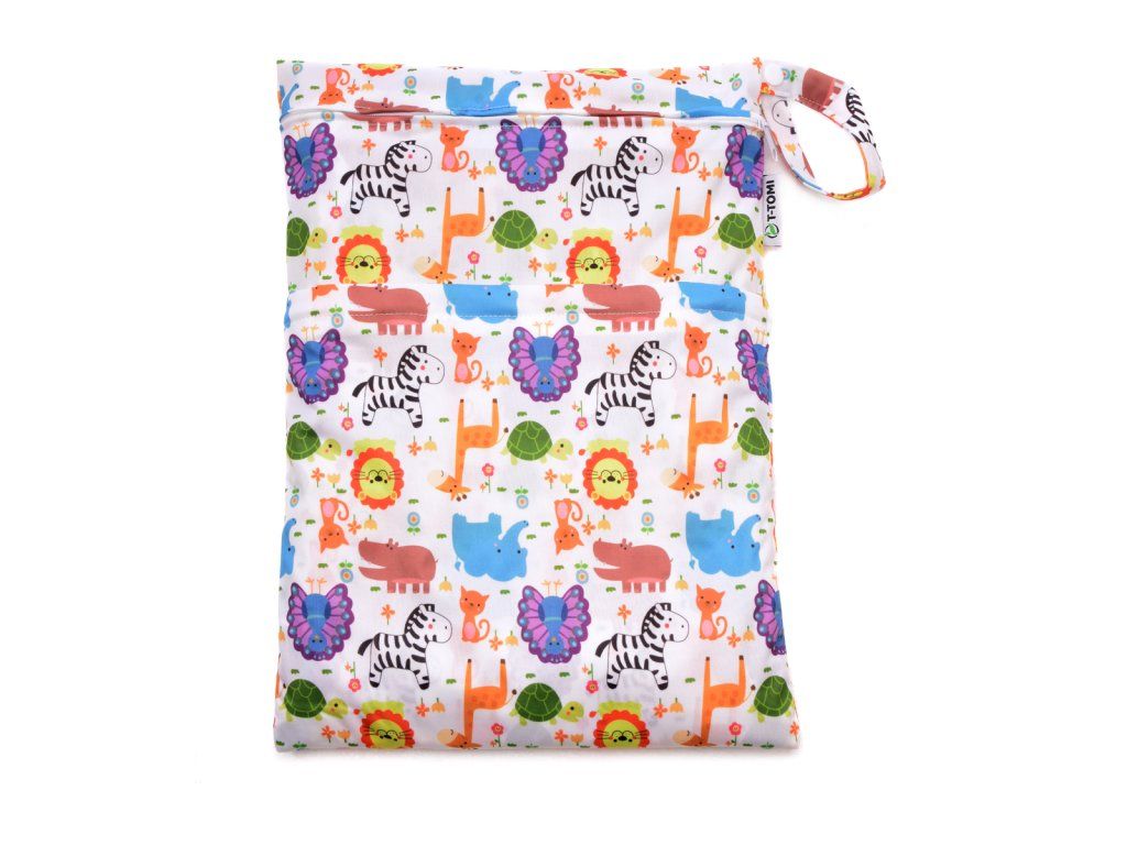 Nepremokavý sáčok T-TOMI je vyrobené zo 100% polyesteru s PUL záterom. Vďaka dvom veľkým vreckám so zapínaním na zips a praktickým uchom s patentkou sa stane Vaším nepostrádateľným pomocníkom nielen doma ale aj na cestách. Je vhodné nielen pre mokré plienky, ale aj pre plavky, uterák, osušku, dudlík, dáždnik či iné všestranné využitie.100% polyester s PUL záterom
