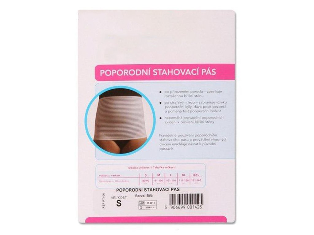 Popôrodný sťahovací pás je určený na použitie, ako po prirodzených, tak operačných pôrodoch. Súčasťou balenia je návod na dychové a svalové popôrodné cvičenia. Rozmer XL (obvod bruška 111-120 cm - meranie sa vykonáva po pôrode). Výška pásu 24cm. Pás je užívateľkami veľmi kladne hodnotený ako skvelá pomôcka v popôrodnom období.