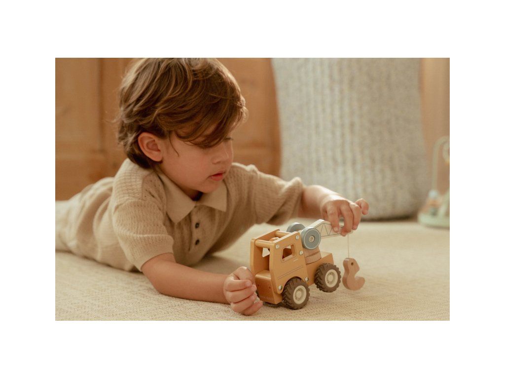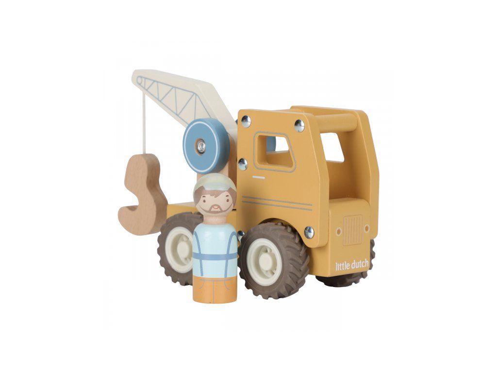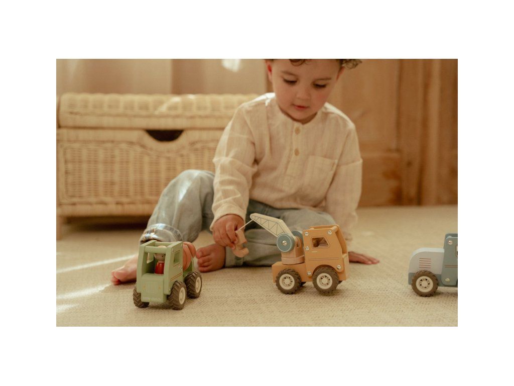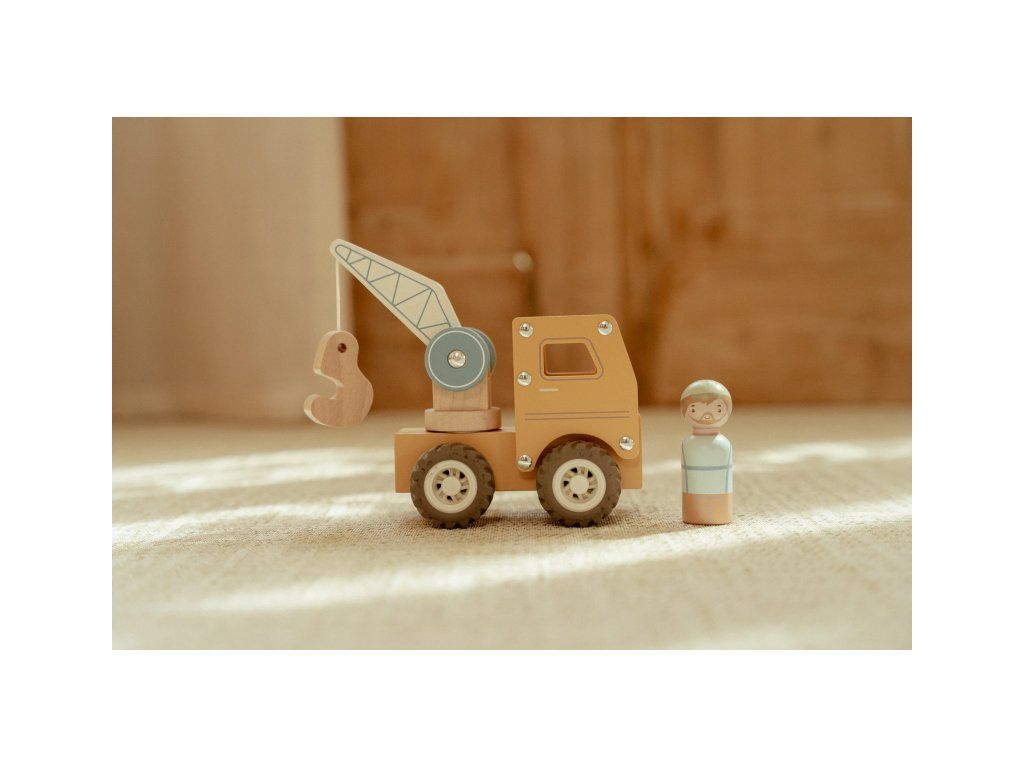 Súčasťou je aj drevená figúrka stavbára, ktorá dodáva hre realistický rozmer. Autožeriav môžete kombinovať s ďalšími stavebnými vozidlami - napríklad s nakladačom, miešačkou alebo sklápačkou - pre kompletné stavebné dobrodružstvo.