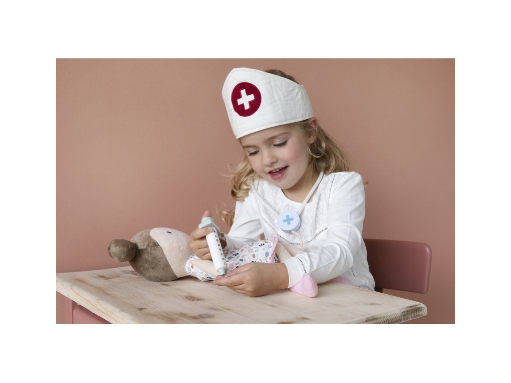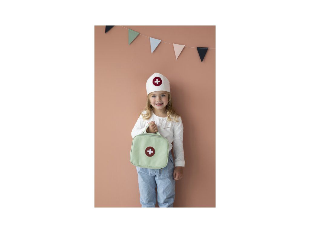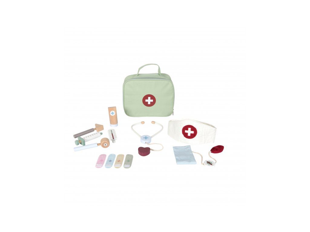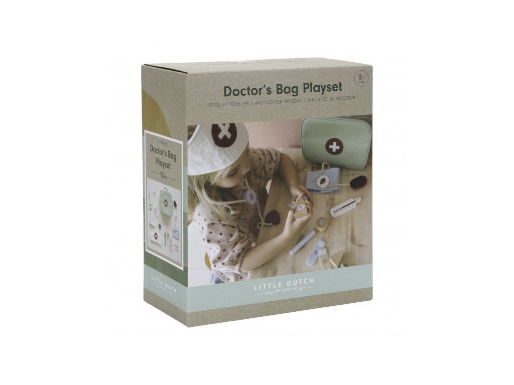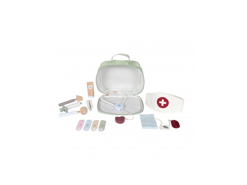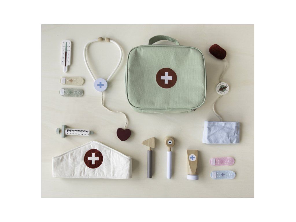 Sada obsahuje: plátenú lekársku tašku, náplaste (4 rôzne farby), teplomer, striekačku, tubu s masťou, stetoskop, reflexné kladivko, tlakomer, otoskop a lekársku čiapku.