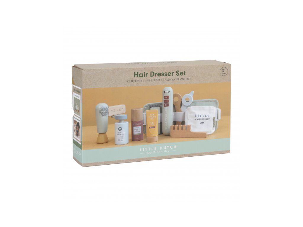Sada v drevenom prevedením obsahuje nožnice, fén, žehličku na vlasy, zastrihávače, hrebeň, šampón, sprej na vlasy a stylingový gél.