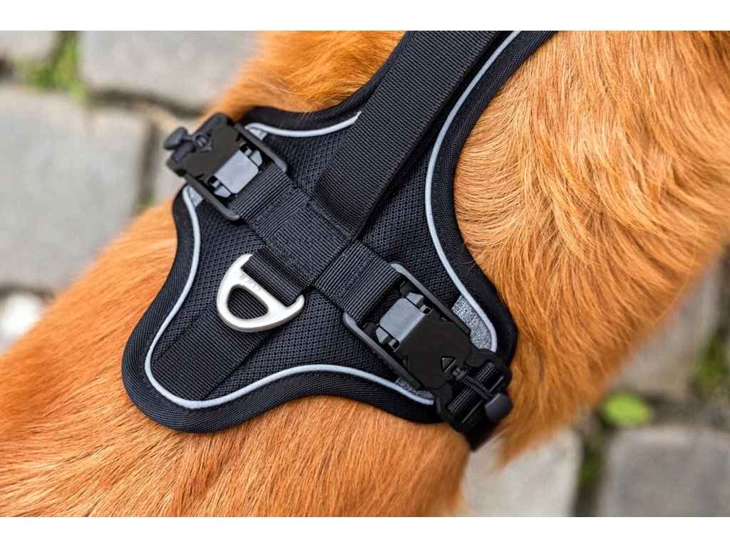 Postroj pre veľkých psov s inovatívnym magnetickým zapínaním vďaka ktorému sa jednoducho používa – pracky fungujú za pomoci magnetickej sily, automaticky sa zatvárajú, a zámok zostáva zaistený . Konštrukcia postroja psa neškrtí, a zabraňuje tak poraneniu nervov a priedušnice. Možnosť nastaviť obvod hrudníka pre čo najpohodlnejšie nosenie. Polstrovaná pracka zabezpečuje, aby sa srsť nezachytávala ani nedráždila.Vlastnosti: