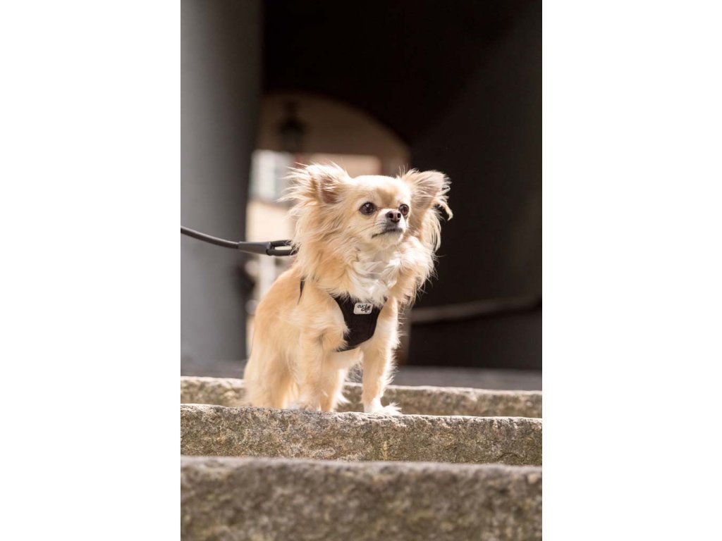 - Postroj vylepšený o praktickú sponu, vďaka ktorej sa vodítko a postroj dajú pripnúť jednou rukou