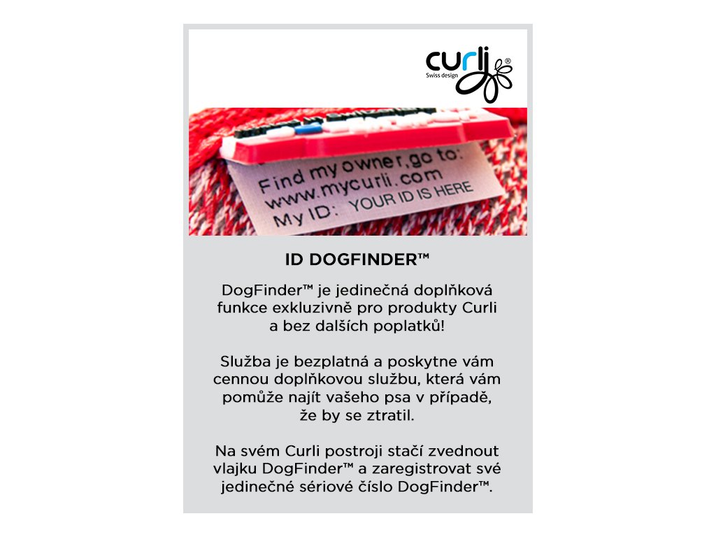- DogFinder ID – sériové číslo umiestnené na postroji je možné online zaregistrovať. Táto služba je bezplatná, a pomôže vám v prípade straty vášho psa. Systém je jednoduchý a funguje non-stop.