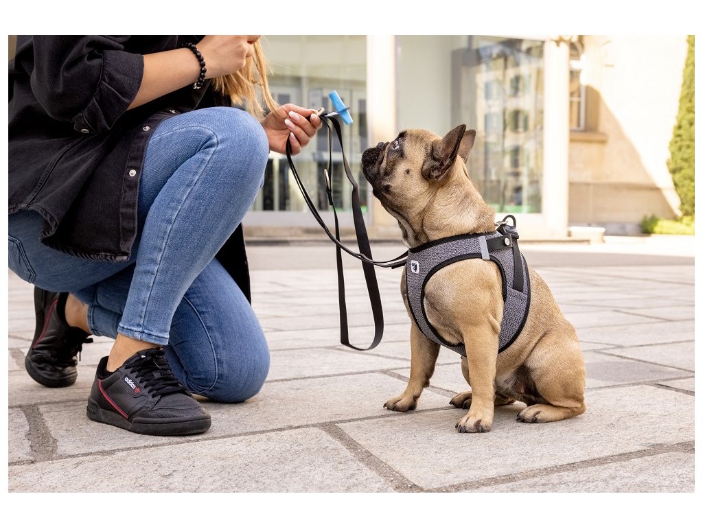 - Postroj vylepšený o praktickú sponu, vďaka ktorej sa vodítko a postroj dajú pripnúť jednou rukou