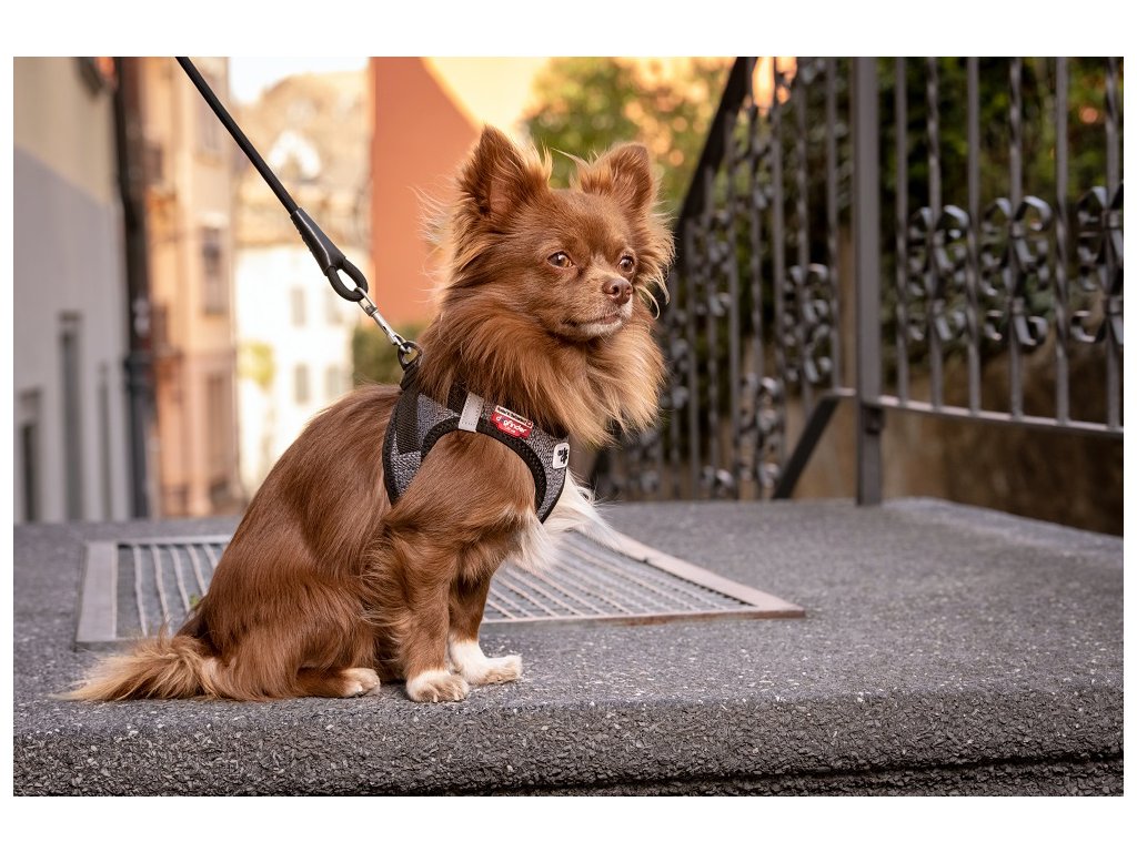 - Postroj vylepšený o praktickú sponu, vďaka ktorej sa vodítko a postroj dajú pripnúť jednou rukou
