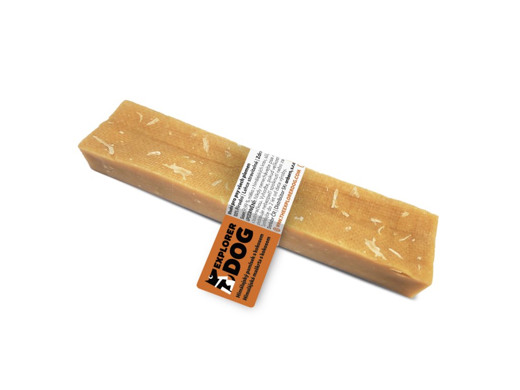 Dentálne tyčinky zo syra so sušeným kokosom sú tvrdé, zdravé a prirodzené maškrty pre psov, ktoré podporujú dentálnu hygienu a pomáhajú odstraňovať zubný kameň. Tieto prírodné syrové maškrty sú ľahko stráviteľné, neobsahujú laktózu, lepok ani konzervačné látky. Vďaka svojmu zloženiu a tvrdosti sú ideálne pre každého psa, bez ohľadu na vek, veľkosť alebo plemeno.Himalájske syry, z ktorých sú tieto maškrty vyrobené, pochádzajú z mlieka voľne chovaných himalájskych kráv. Proces výroby začína hodinovým varením mlieka, aby sa odstránil všetok tuk a zaistila sa pasterizácia. Potom sa pridáva trocha soli a limetkovej šťavy (celkom len 0,01 %) na zrážanie. Nasleduje lisovanie syra po dobu 2-3 dní, aby sa odstránila vlhkosť. Bloky syra sú potom nakrájané na primerane veľké kusy a sušené v udiarni po dobu 20-30 dní, čo im dodáva tvrdosť a jemnú, dymovú chuť.