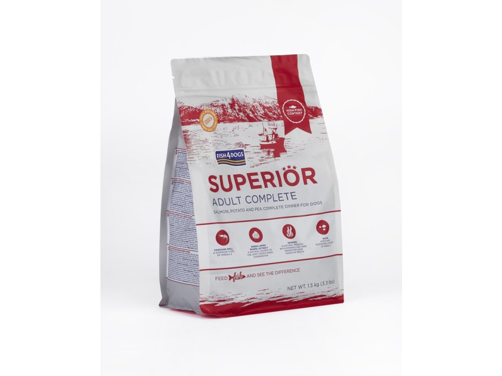 Granule Superior pre dospelých psov s príchuťou lososa, zemiakov a hrášku.Vysoký obsah omega 3 z morských rýb – skvelé pre srsť, kožu a kĺby.