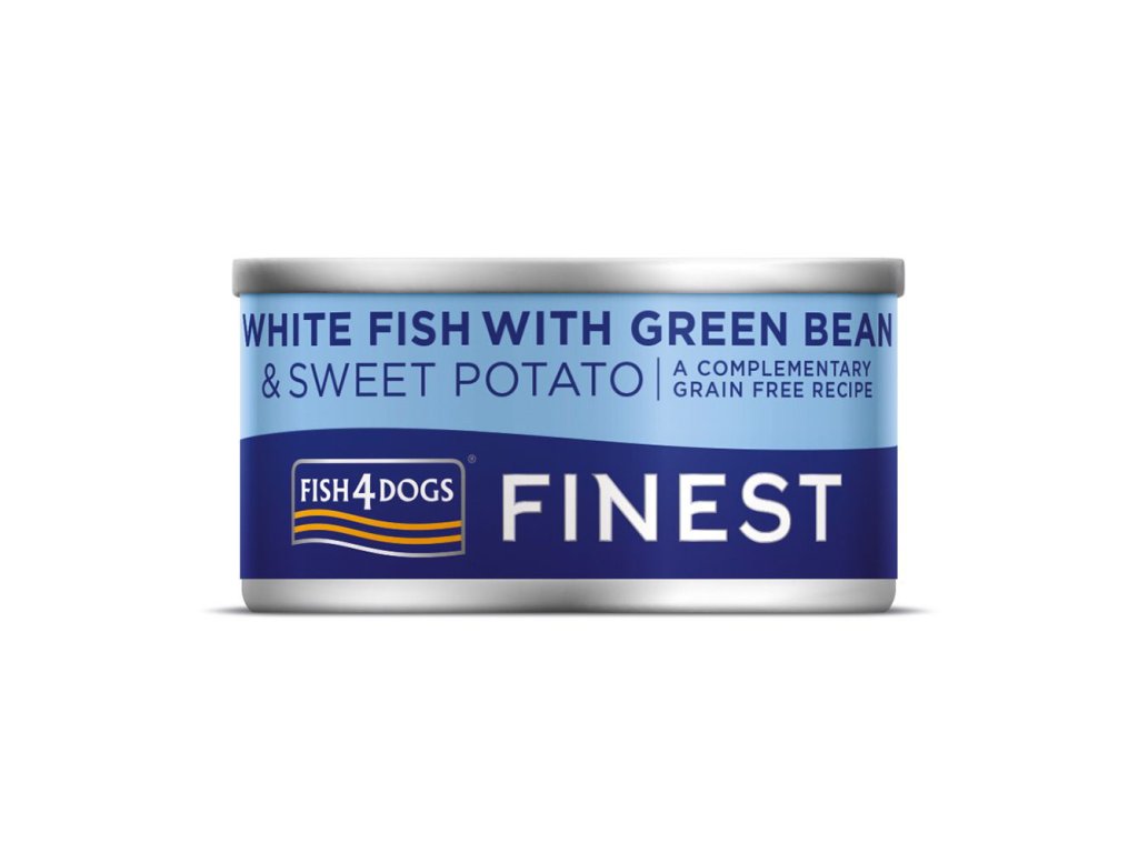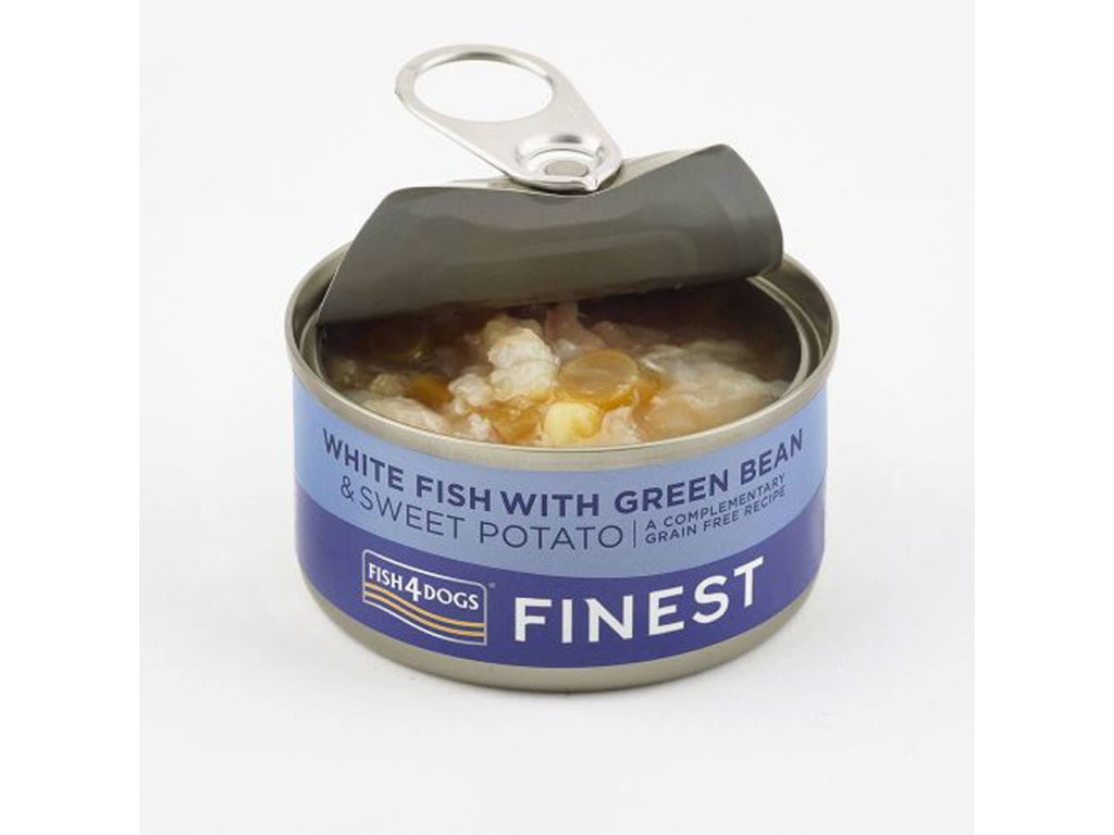 FISH4DOGS Konzerva pre psov Finest s bielou rybou, sladkými zemiakmi a zelenými fazuľkami 85g