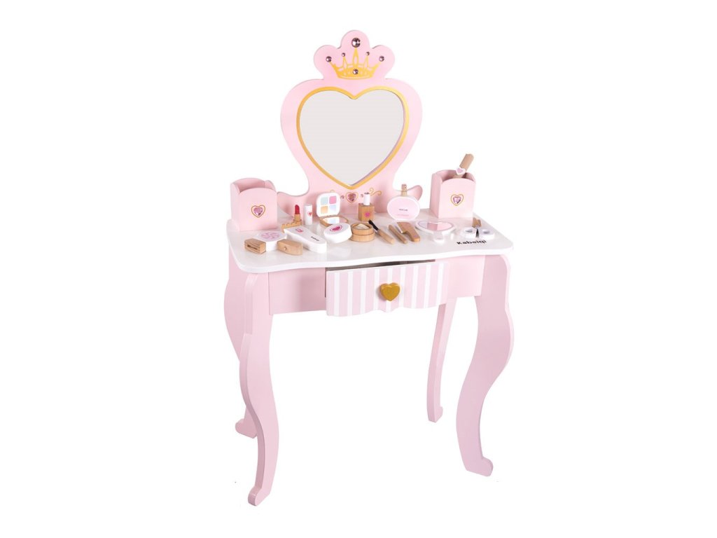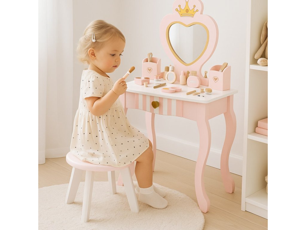 Toaletný stolík obsahuje bohaté príslušenstvo, stoličku a veľké zrkadlo v tvare srdca. Ponúka množstvo úložného priestoru na všetky poklady malej princeznej.