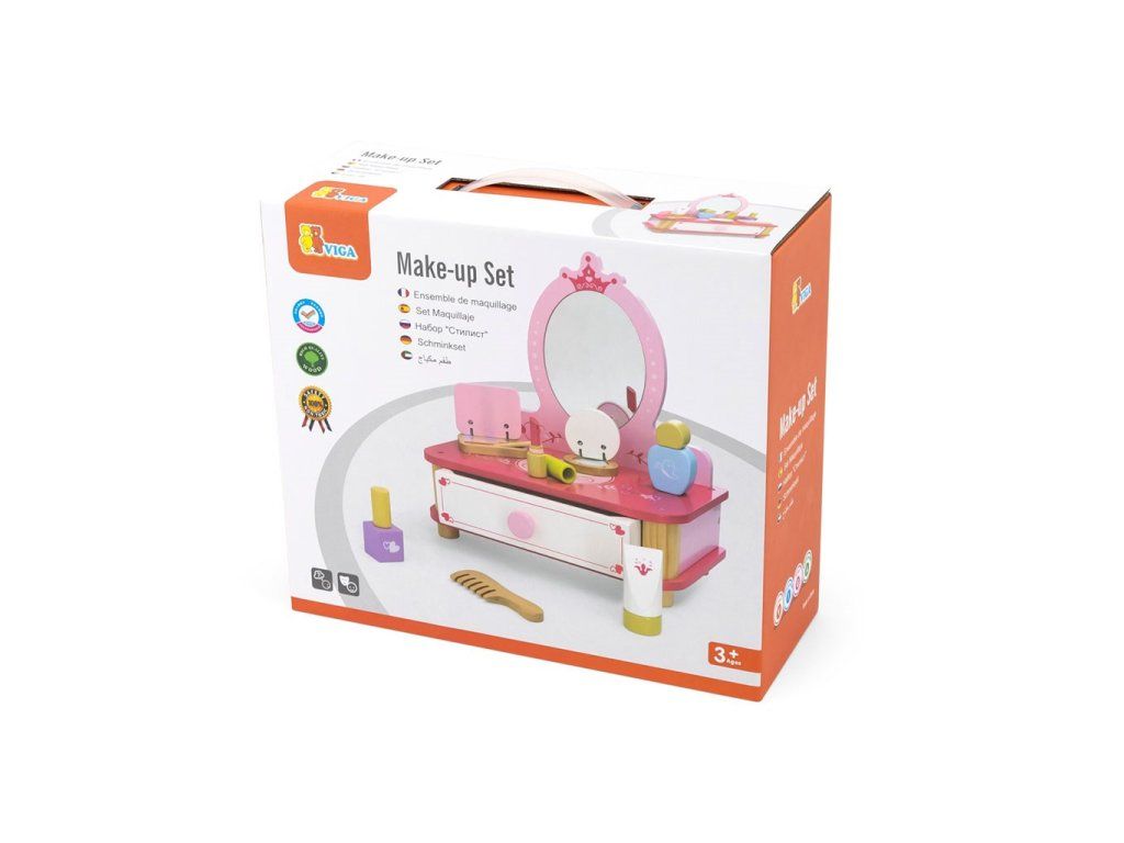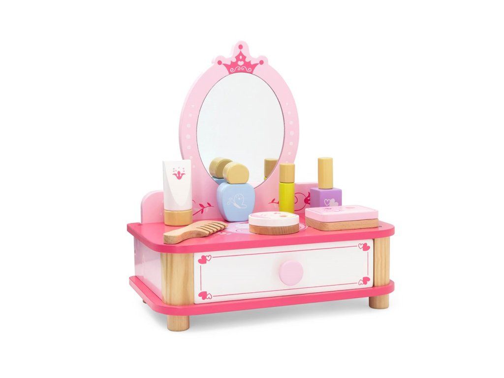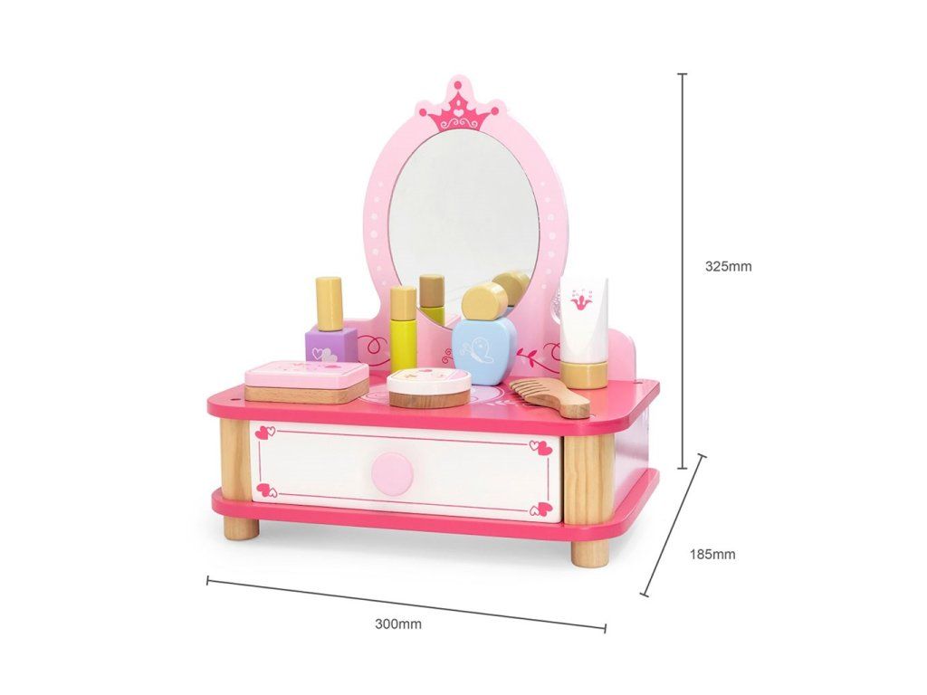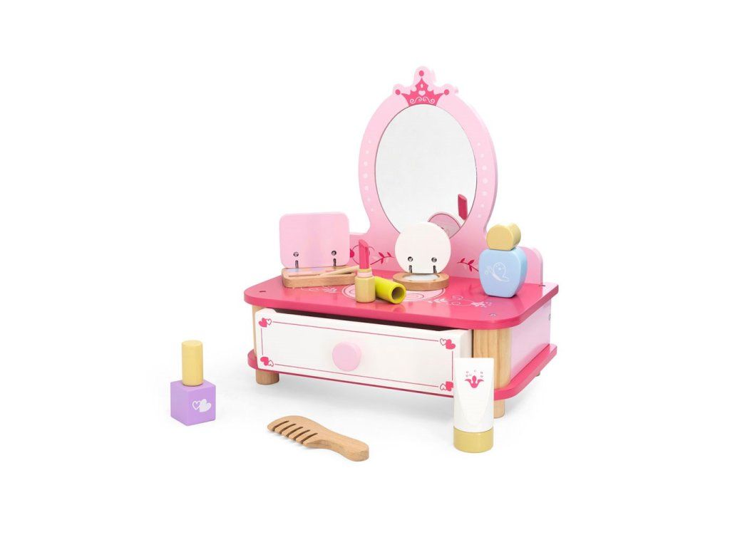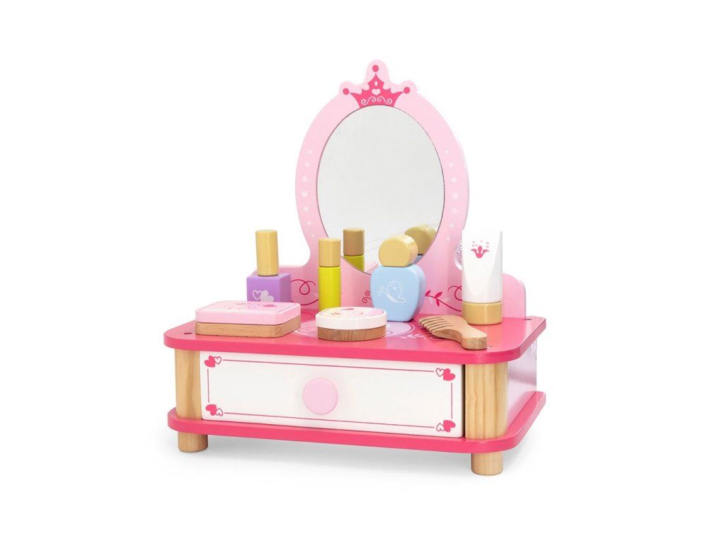 Každé malé dievčatko rado napodobňuje svoju mamičku, a tento rozkošný drevený toaletný stolík so zrkadlom a kozmetickými doplnkami bude skvelým doplnkom pre jej hru. Toaletný stolík obsahuje všetko, čo malá vizážistka potrebuje vo svojom domácom salóne, a výsuvná zásuvka pojme všetky potrebné doplnky, šperky alebo iné poklady. Doprajte svojmu dieťaťu krásny darček, ktorý ho prenesie do sveta fantázie.