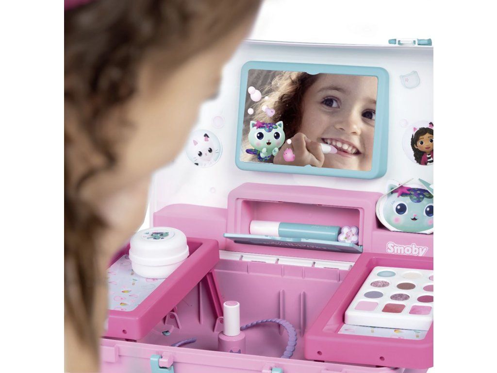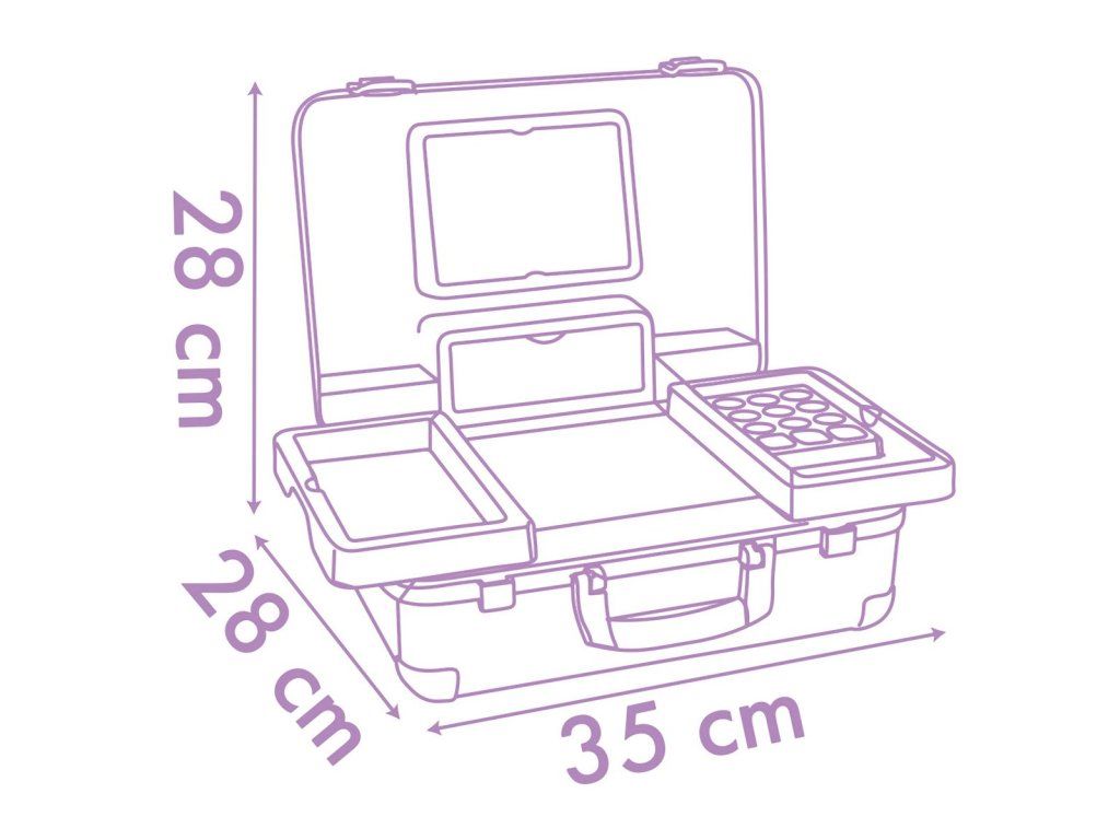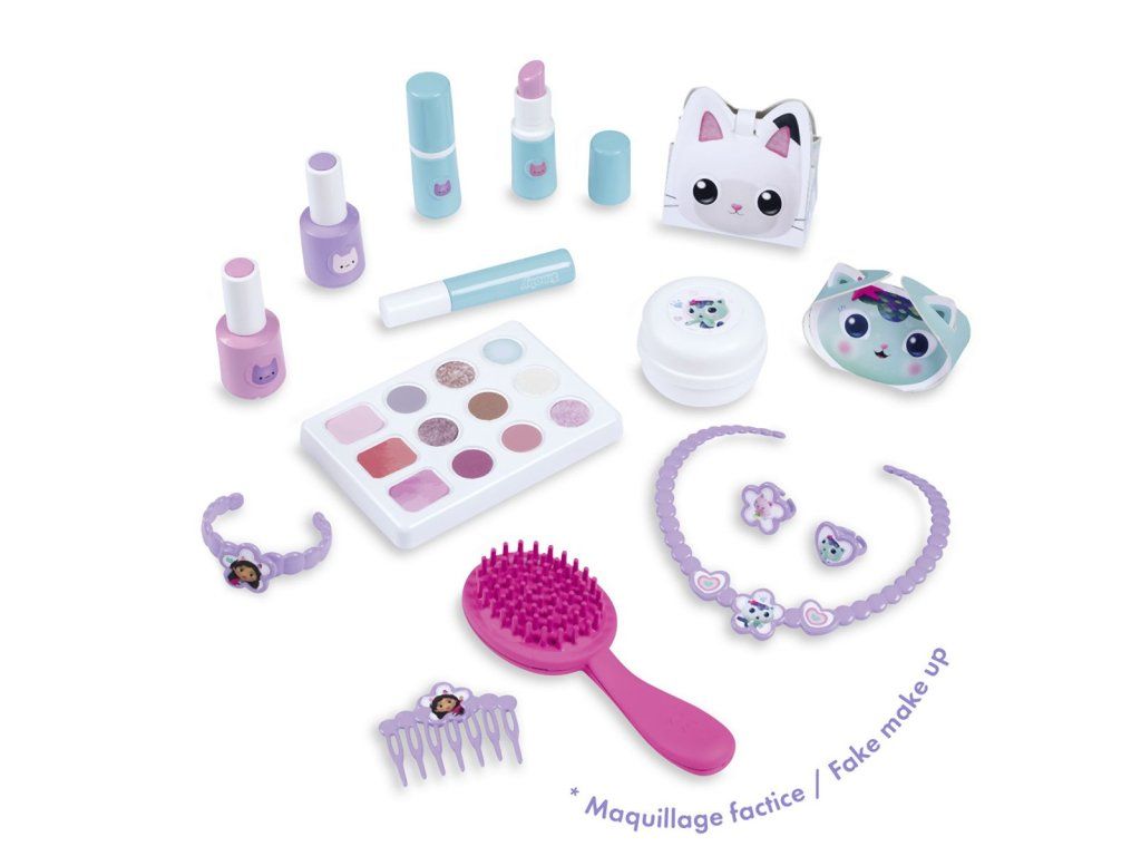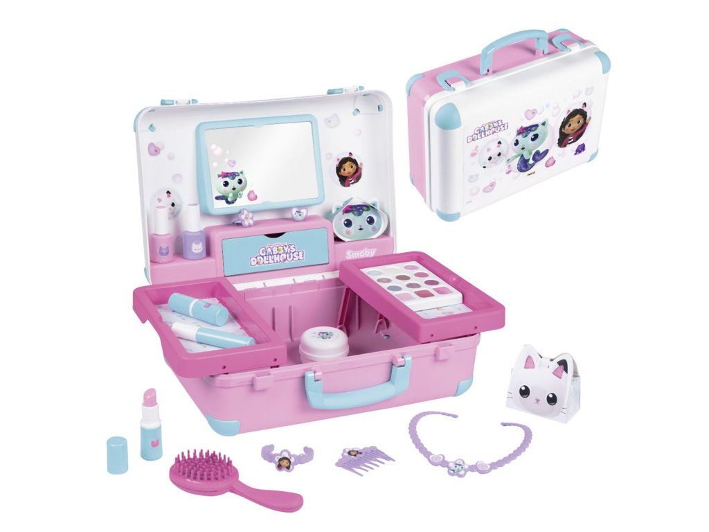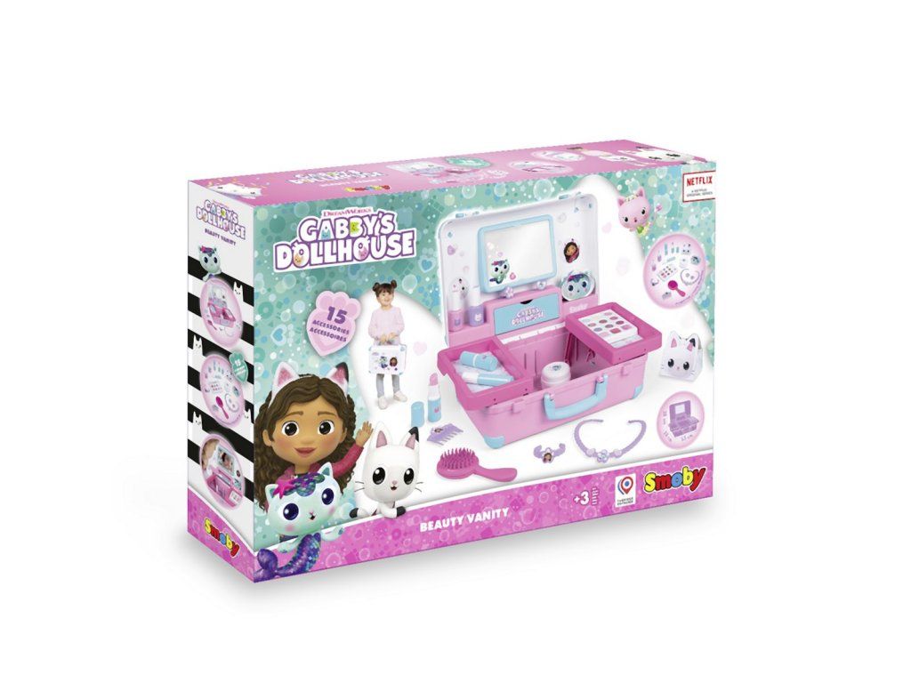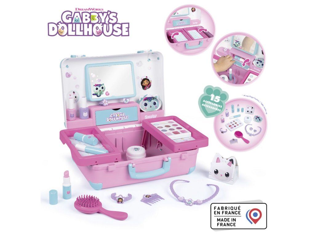 Kozmetický kufrík v dizajne Gabby´s Dollhouse je naplnený všetkým, čo je potrebné pre skvelé mobilné wellness, či už ide o účes, nechtový salón alebo make-up. Všetkých 15 doplnkov (atrapy kozmetiky na hranie) nájdete vo vnútri kufríka s rukoväťou, ktorý možno vziať kamkoľvek: 2 laky na nechty, 2 rúže, paleta očných tieňov, riasenka, štetec, spona, hrebeň, náhrdelník, náramok, 2 prstene, nádobka na krém a 2 krabičky. Vďaka možnosti zamknutia sa na ceste z kufríka nič nestratí. Navyše má zrkadlo a tajnú priehradku. Police vo vnútri je možné sklopiť, na vytvorenie priestoru pre ďalšiu kozmetiku. Rozmery produktu (D׊×V): 35,5 × 28,6 × 28,5 cm.Dodatočné parametre
