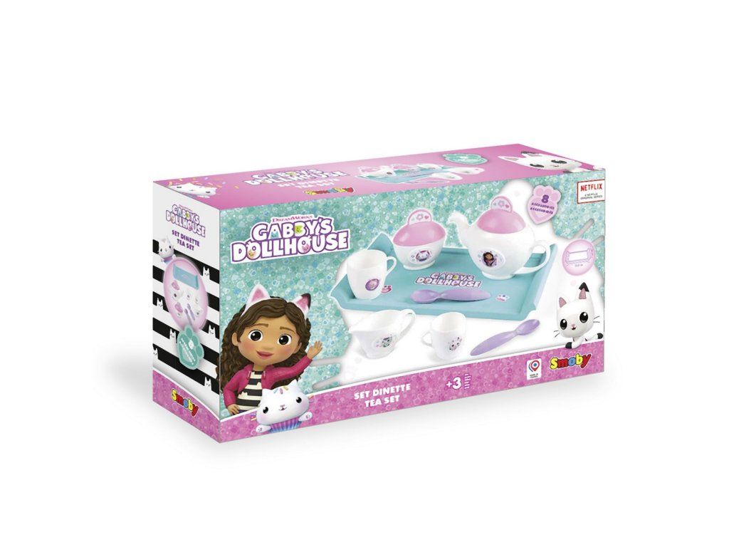 Súprava na servírovanie čaju s táckou Gabby´s Dollhouse. Obsahuje 8 ks príslušenstva: tácka, 2 šálky, dve lyžice, kanvičku na čaj, cukorničku s pokrievkou a kanvičku na mlieko. Rozmery tácky 26 x 14,2 x 2,6 cm. Hmotnosť: 0,197 kg.Dodatočné parametre
