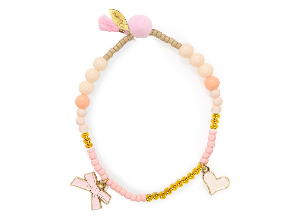 Náramok Gisele Elegancia na zápästí: koráliky, mašlička a srdiečko s brmbolcom a strapcom bez zapínaniaNáramok Gisele je jemný detský doplnok. Farebné akrylové koráliky dopĺňajú 2 smaltované kovové prívesky v tvare stuhy (mašličky) a srdiečka, navyše brmbolec a strapec, ktoré šperku dodajú hravý pohyb. Vďaka dvojitej elastickej niti sa náramok ľahko navlieka a pohodlne drží – bez potreby zapínania.Rýchly prehľad odporúčaný vek: od 3 rokov rozvíja: sebavyjadrenie, estetické cítenie, jemnú motoriku pri obliekaní v balení: 1× náramok s korálikmi, príveskami, brmbolcom a strapcomPrečo si ho deti zamilujú jemný motív – nežný detail ku každému outfitu bez zapínania – stačí navliecť na ruku dvojitá elastická niť – pevnejšie a pohodlné nosenie brmbolec a strapec – hravý akcent, ktorý krásne vynikneObsah balenia 1× náramok s akrylovými korálikmi 2× smaltovaný kovový prívesok (stuha, srdce) 1× brmbolecDodatočné parametre