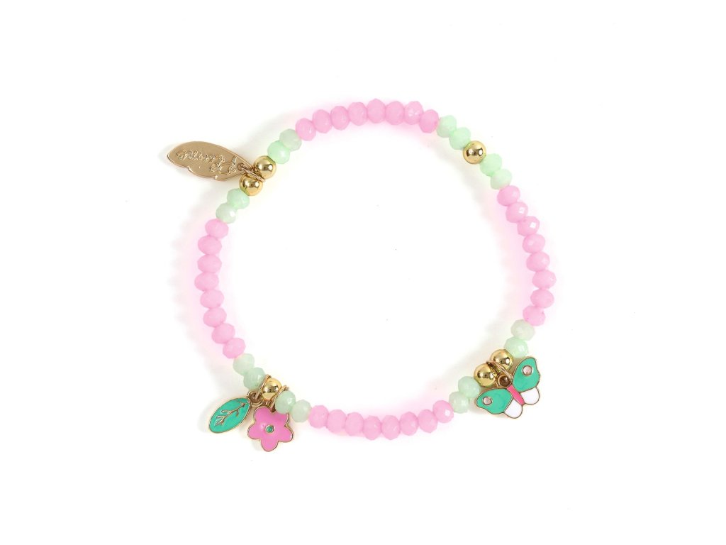 Náramok Lila Korálkový náramok, ktorý sa navlieka sám: bez zapínania a bez trápeniaNáramok Lila je farebný náramok z akrylových korálok, doplnený o tri smaltované prívesky (motýľ, list a kvietok) a zlatý detail. Dvojitá elastická niť zvyšuje odolnosť a uľahčí nasadenie.Rýchly prehľad odporúčaný vek: od 3 rokov rozmer: priemer náramku cca 6 cm zapínanie: bez zapínania (elastická niť)Obsah balenia 1× náramokDodatočné parametre